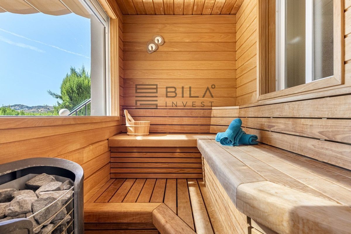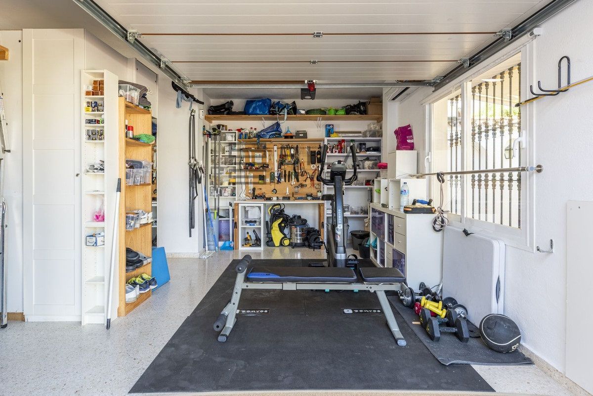 También dispone de sauna con sistema de sonido y vistas al jardín para los días más frescos de invierno. El garaje, con puerta eléctrica y aire acondicionado, se utiliza actualmente como gimnasio y trastero. En la entrada hay espacio adicional para aparcar bajo una práctica marquesina.