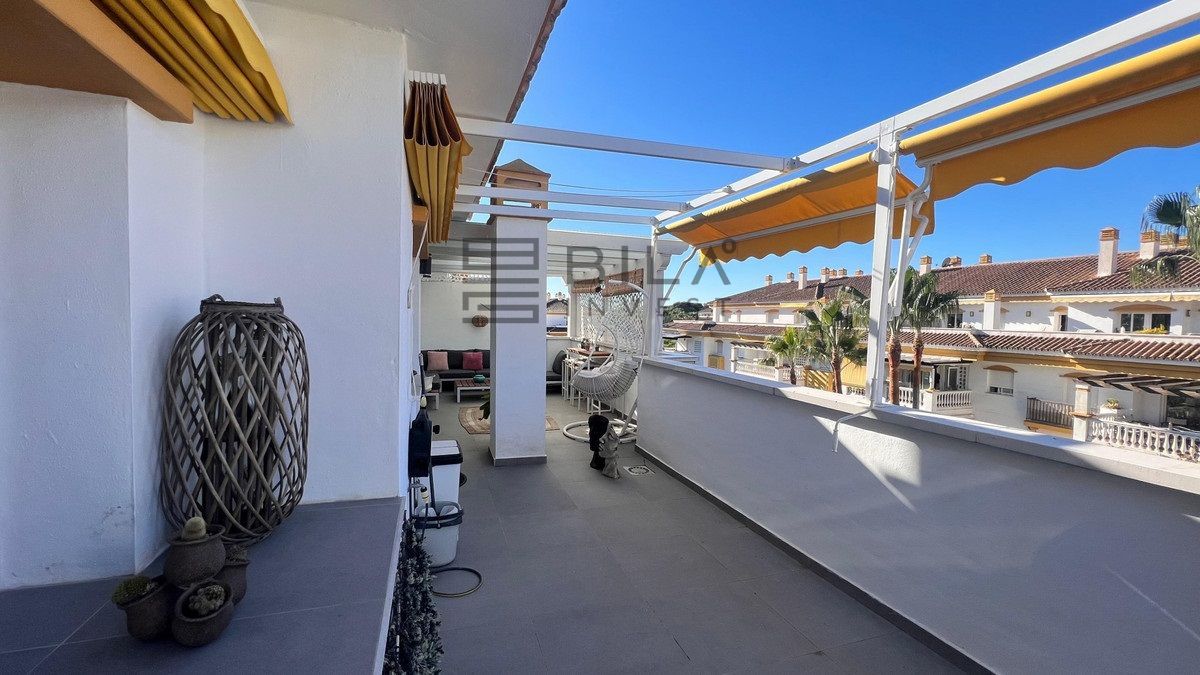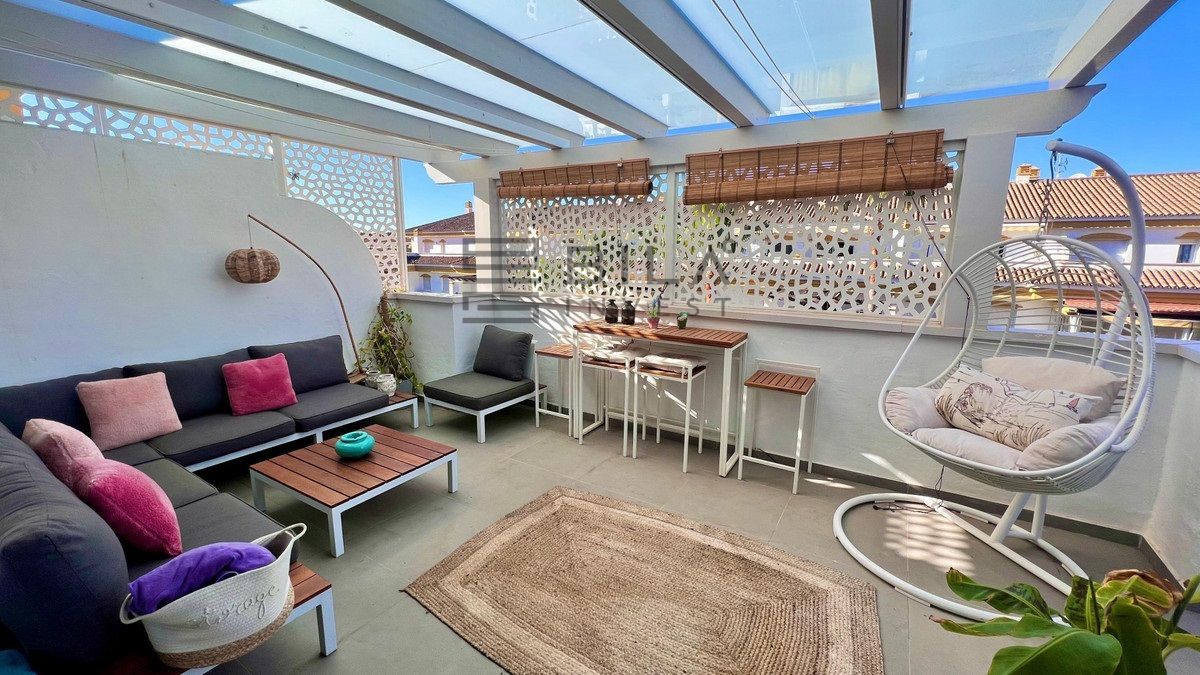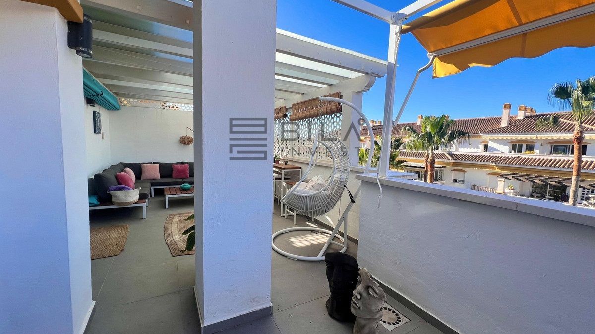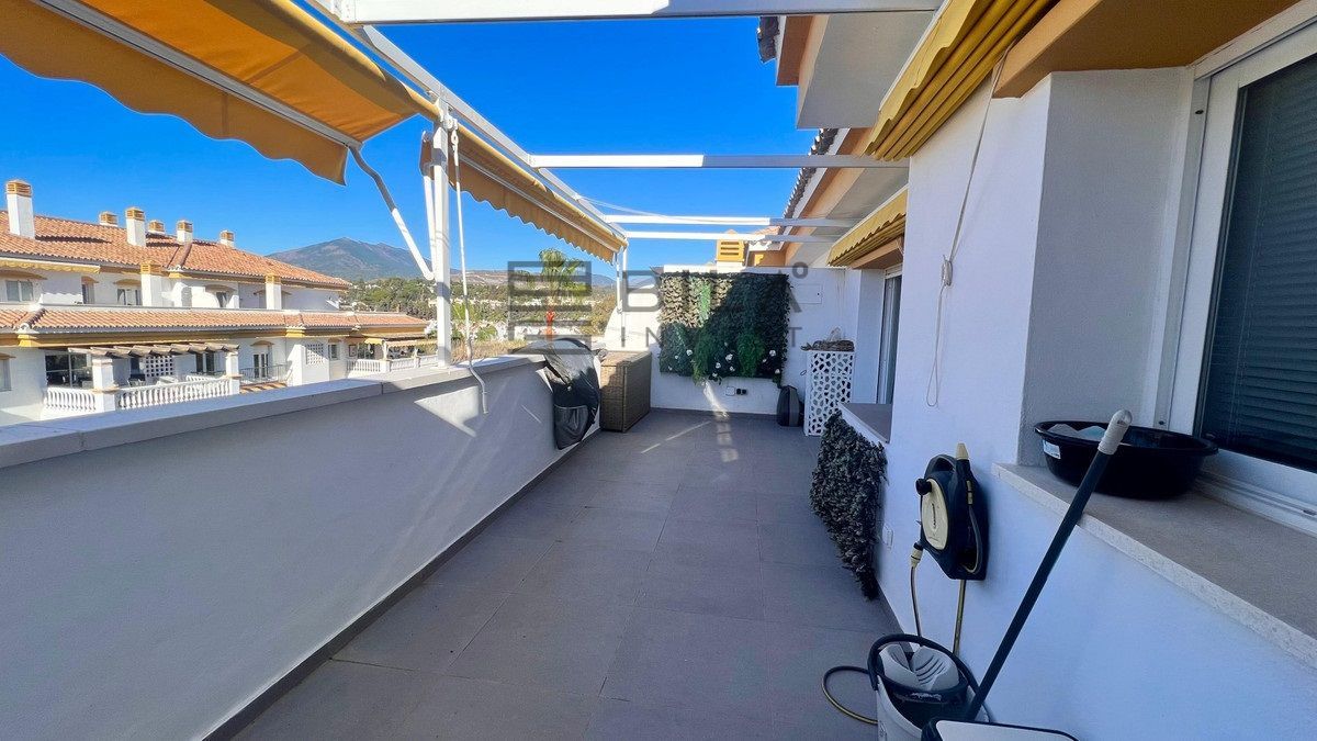 Luminoso ático con amplia terraza perimetral que recorre toda la vivienda, con zona cubierta, vistas abiertas a la montaña y a los cuidados jardines de la urbanización, perfecta para disfrutar de los atardeceres y del clima de la Costa del Sol.