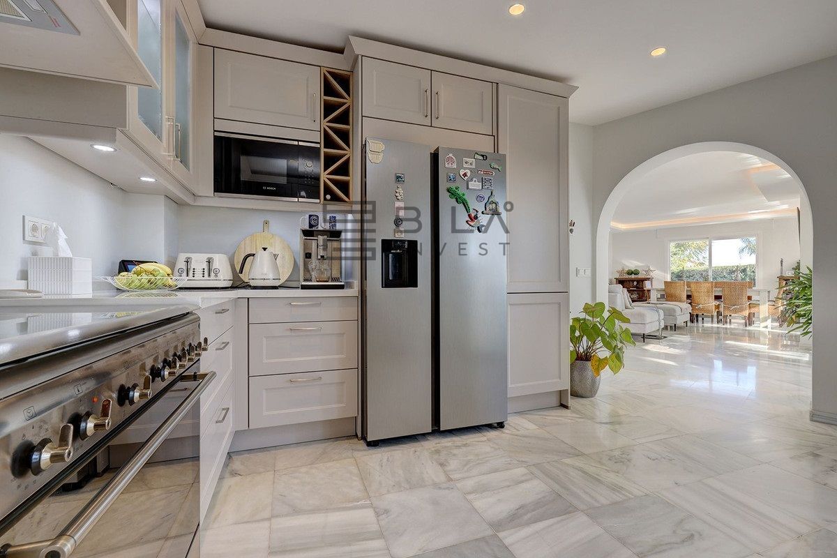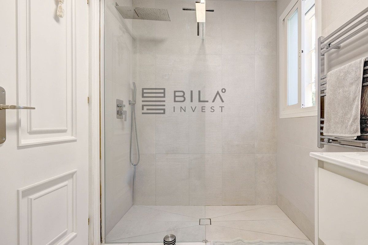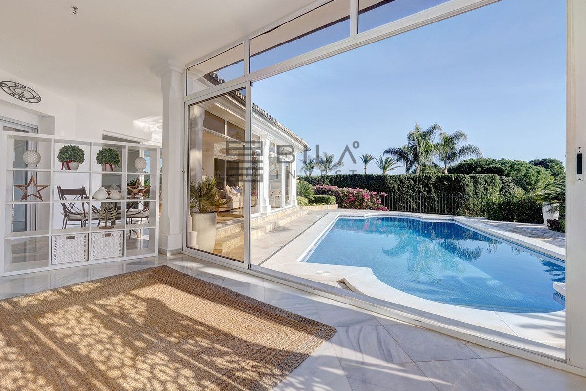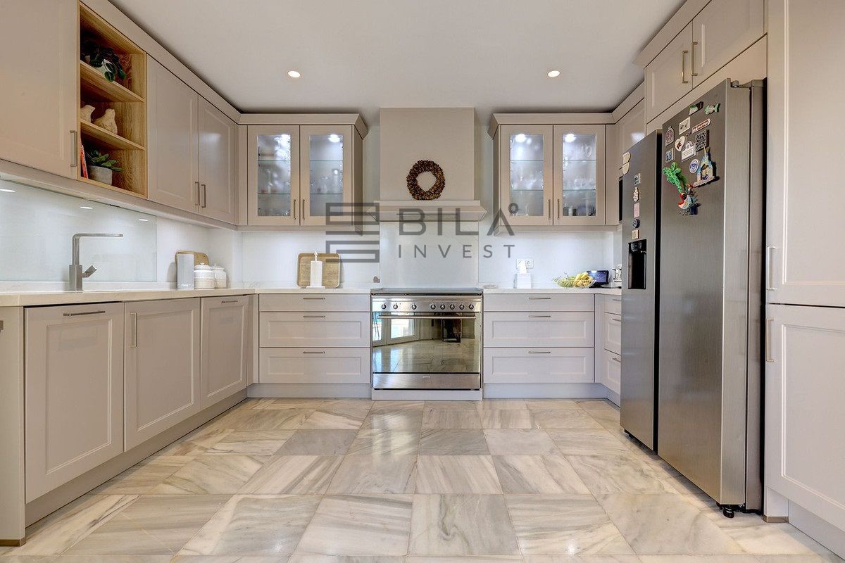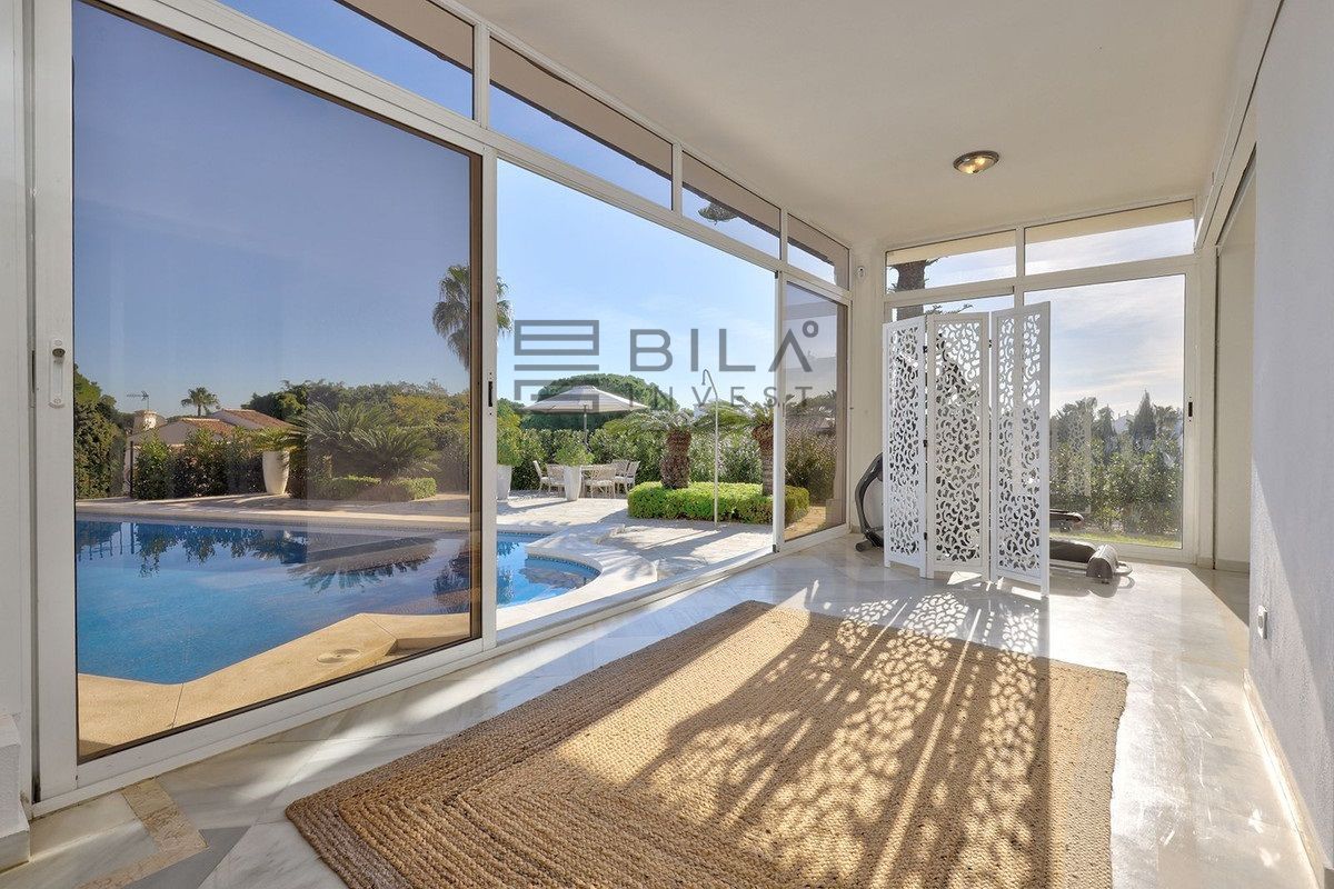 A la izquierda, se accede a un amplio salón abierto, lleno de luz natural, que da directamente a una amplia terraza que da a la piscina, el patio y el jardín. Con sus 11 x 5 m, la piscina tiene un tamaño realmente bueno. Actualmente, la terraza está acristalada, pero podría abrirse fácilmente si un nuevo comprador lo desea. La cocina es semiabierta al salón. Ha sido completamente reformada y también tiene acceso a la terraza y a la piscina.