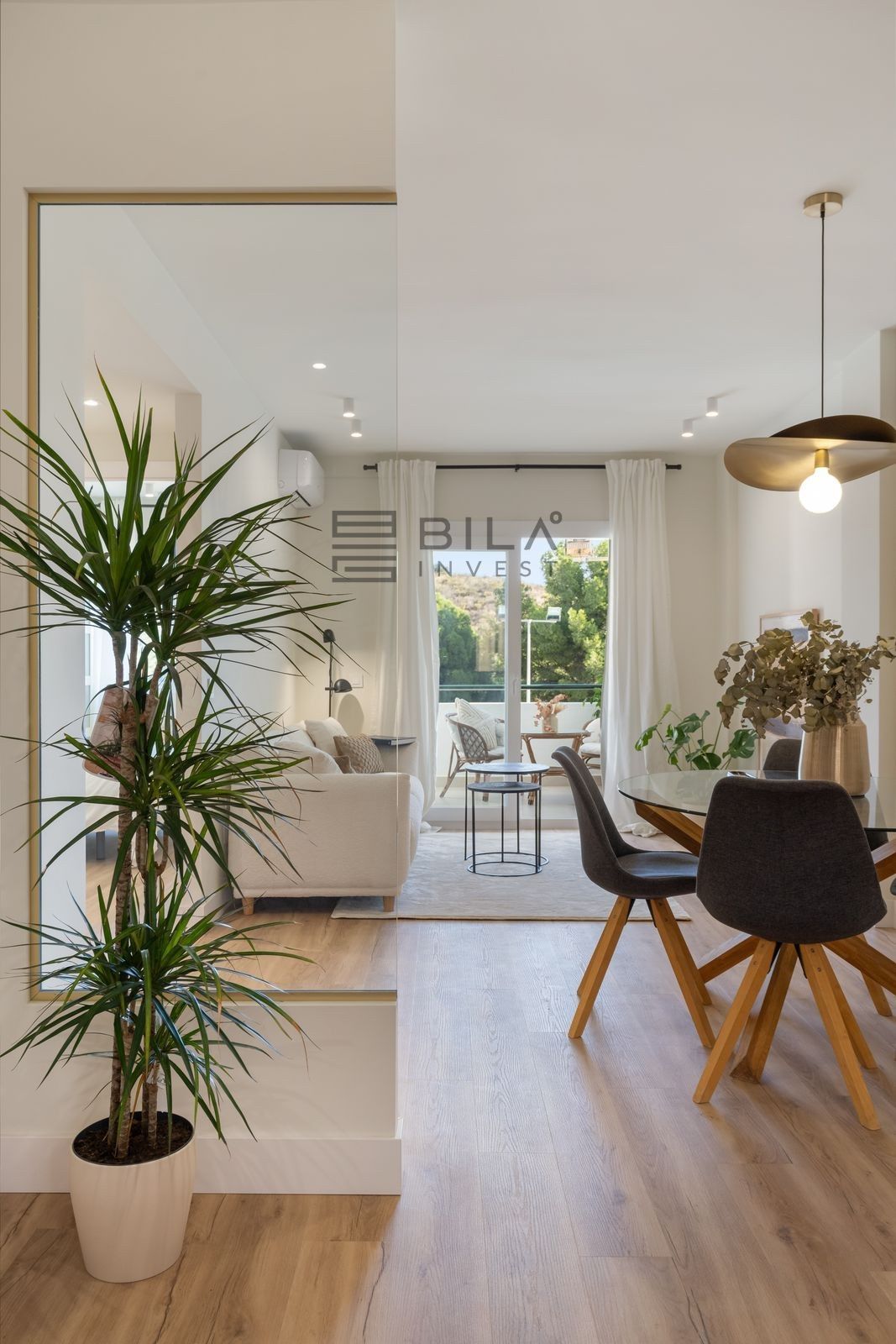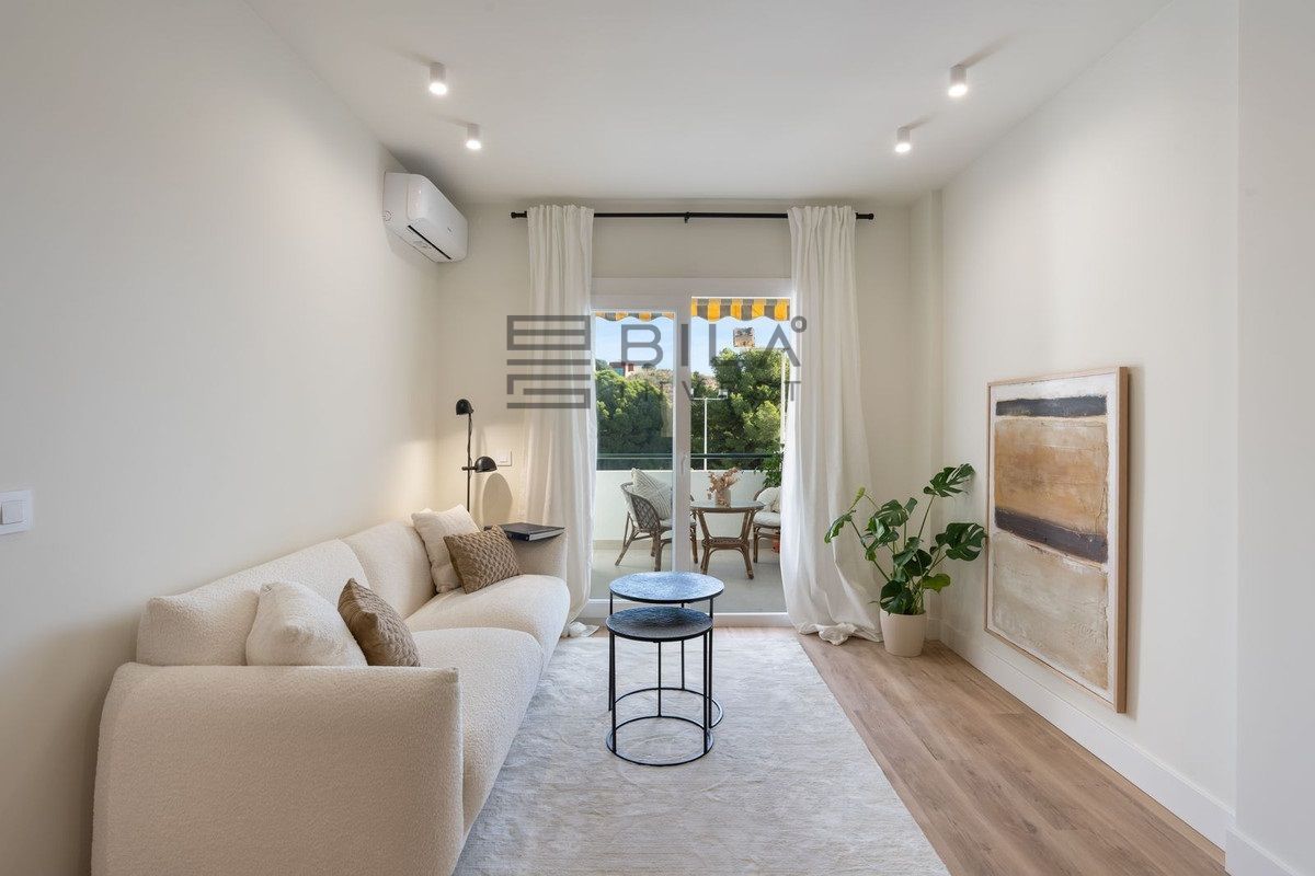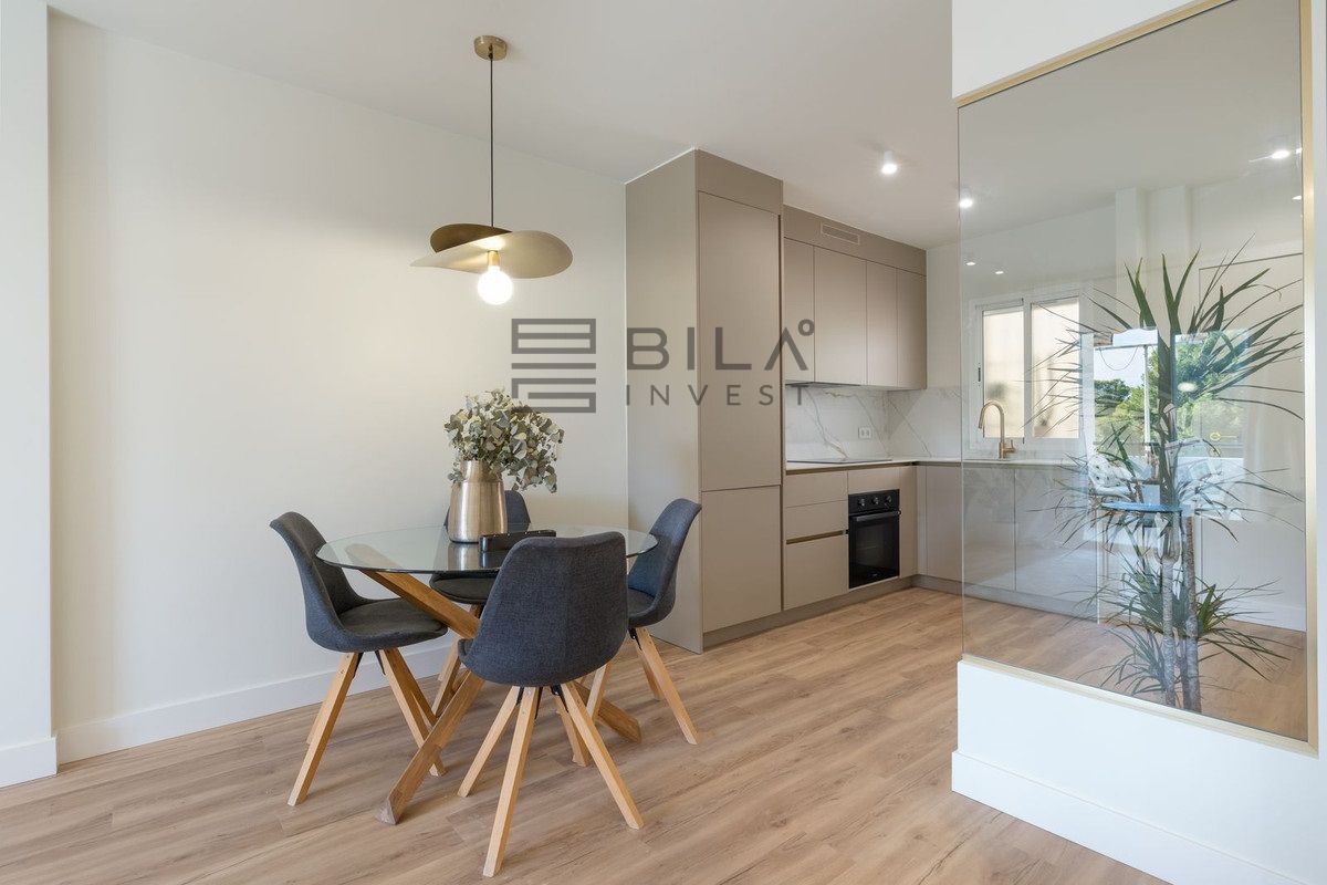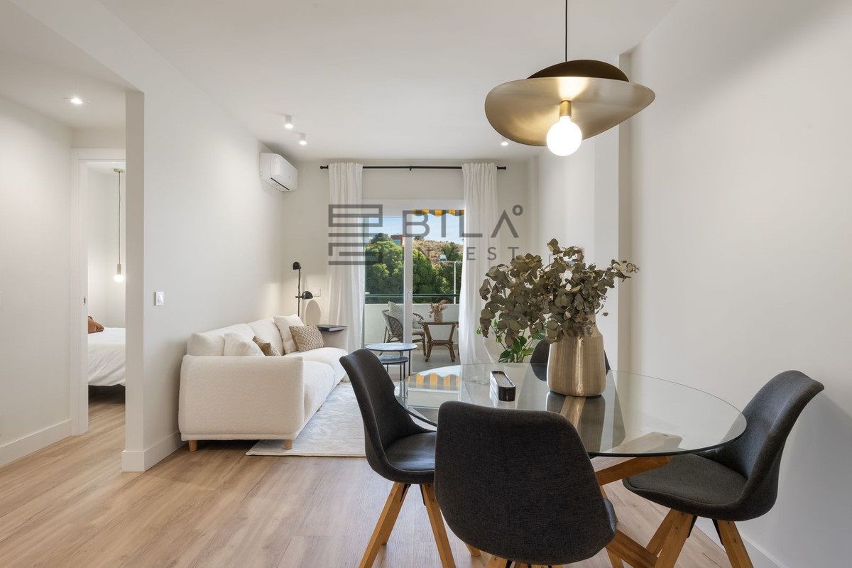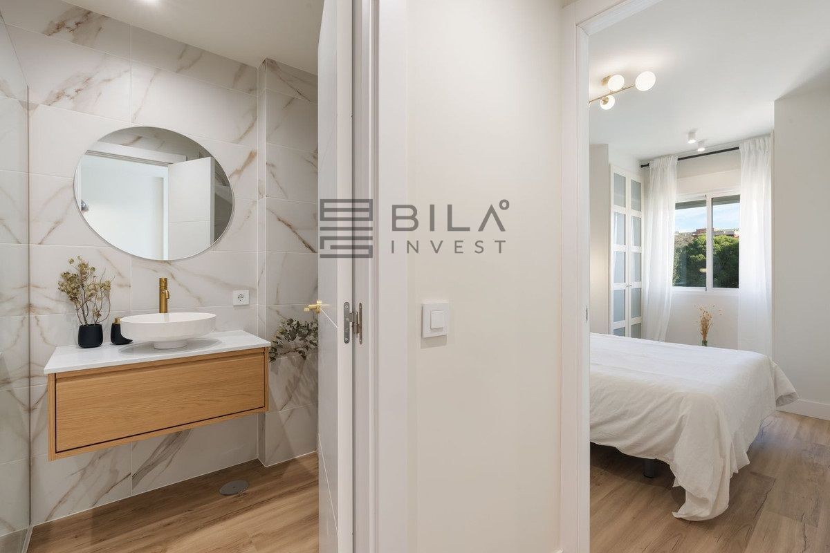 Al entrar, te recibe un luminoso salón de planta abierta donde el estilo y la funcionalidad se integran a la perfección. La cocina está equipada con elegante encimera de mármol natural Calacatta y acabados contemporáneos, complementando el estiloso baño y los materiales de alta calidad presentes en toda la vivienda. El aire acondicionado en el salón y el dormitorio principal garantiza confort durante todo el año, mientras que el ventilador de techo en el segundo dormitorio aporta una agradable ventilación natural.