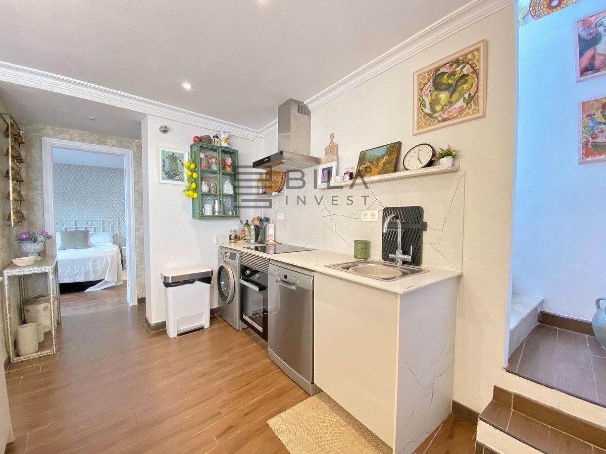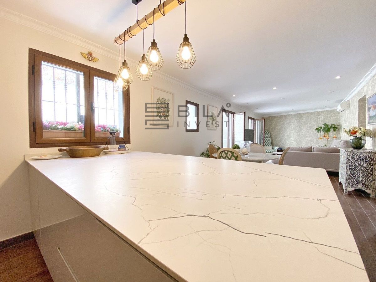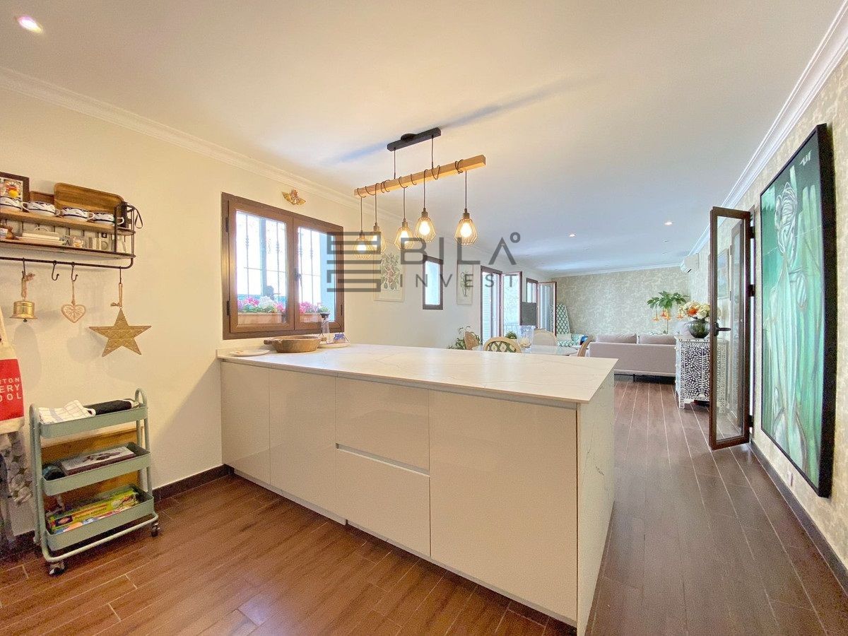 En la planta superior; hay un impresionante salón comedor con balcones a la calle y otro pequeño balcón hacia el patio interior de la casa. Una moderna cocina con isla central. Y 2 dormitorios dobles, ambos con cuarto de baños en suite.
