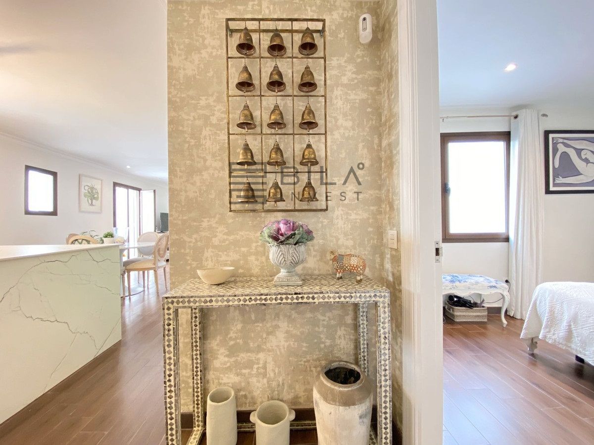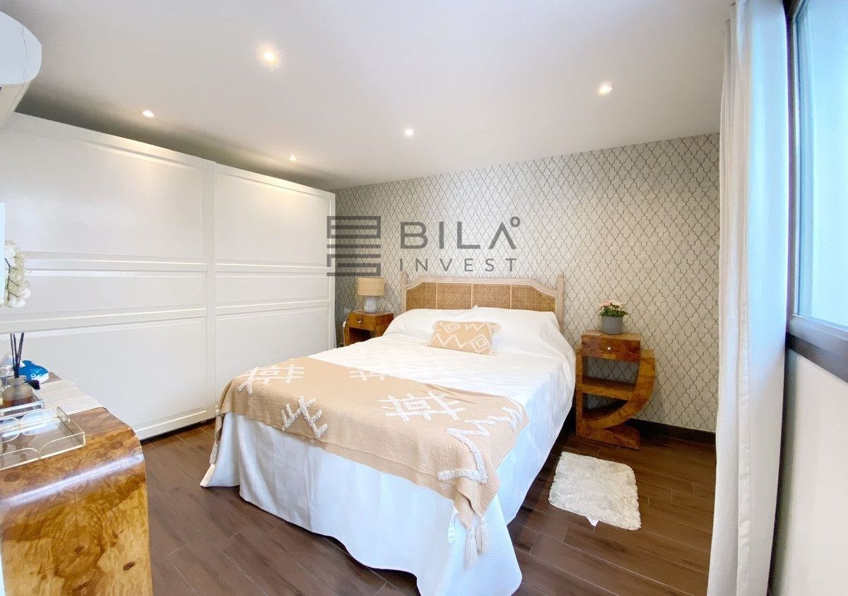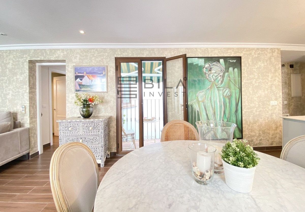 En la planta superior; hay un impresionante salón comedor con balcones a la calle y otro pequeño balcón hacia el patio interior de la casa. Una moderna cocina con isla central. Y 2 dormitorios dobles, ambos con cuarto de baños en suite.