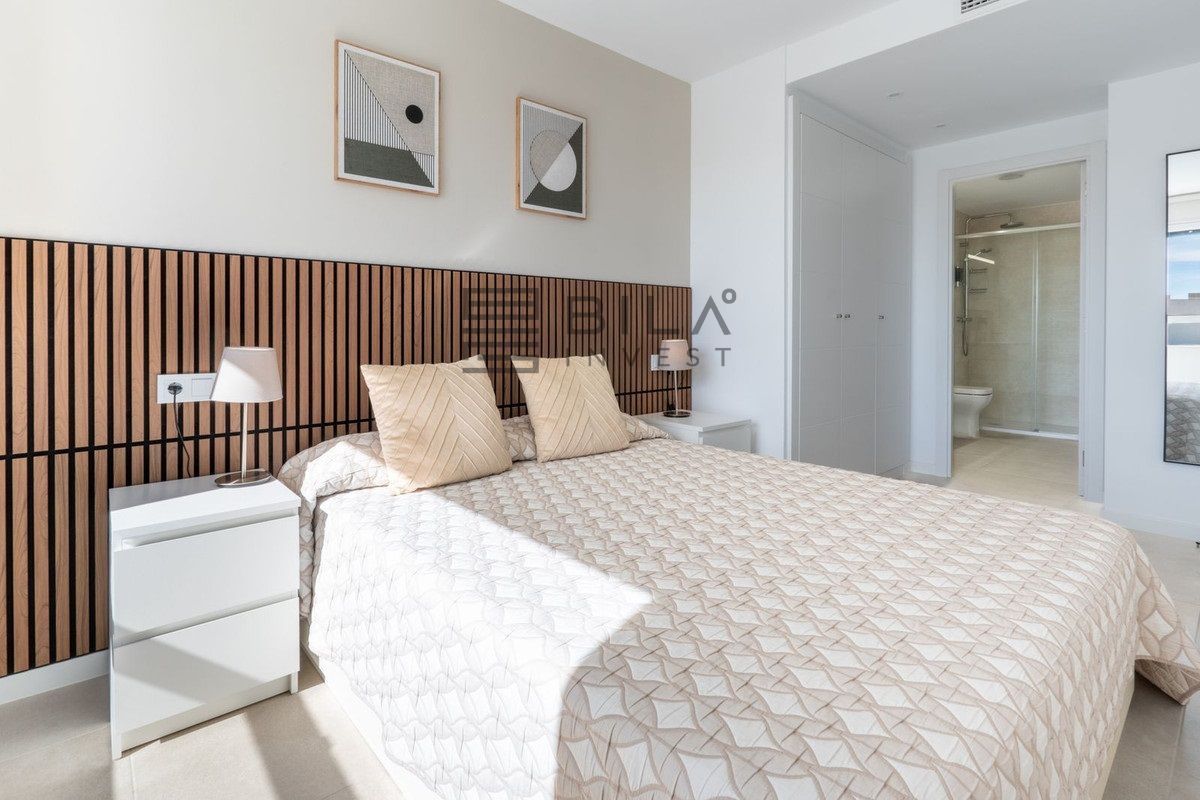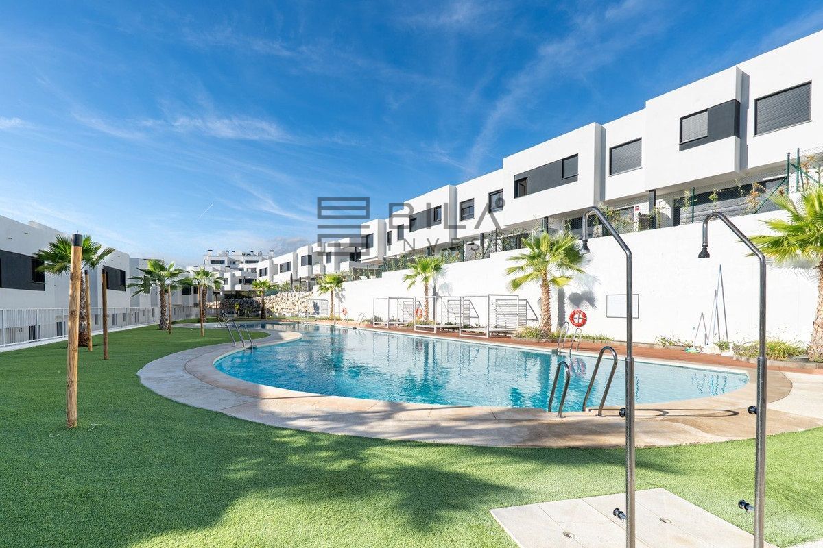 La vivienda ofrece varias habitaciones distribuidas en dos plantas, incluyendo dormitorio en suite, armarios empotrados, cocina equipada de estilo minimalista, salón-comedor con acceso al jardín, zona de lavandería y plaza de aparcamiento. La urbanización cuenta con piscina comunitaria, jardines y áreas de descanso. Ideal para quienes buscan una propiedad lista para entrar a vivir, con estética moderna, privacidad y un entorno residencial de alto nivel.