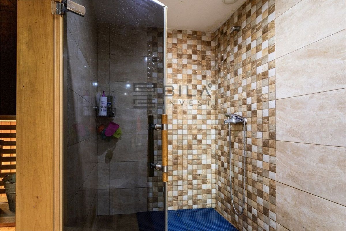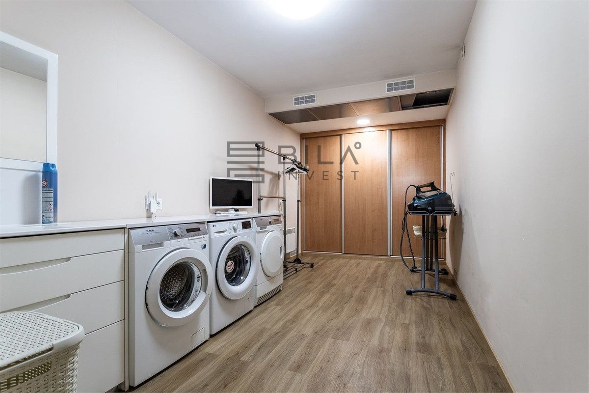 Con una superficie de 104 m², alberga un práctico taller, cuarto de lavandería completamente equipado con lavadora, secadora y armarios de almacenaje, y una sala adicional con ducha y sauna, ideal para crear un espacio de relajación en casa.