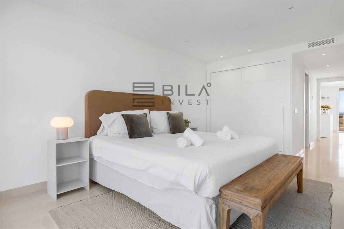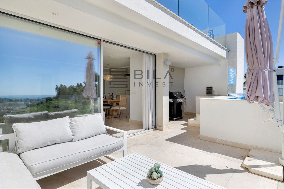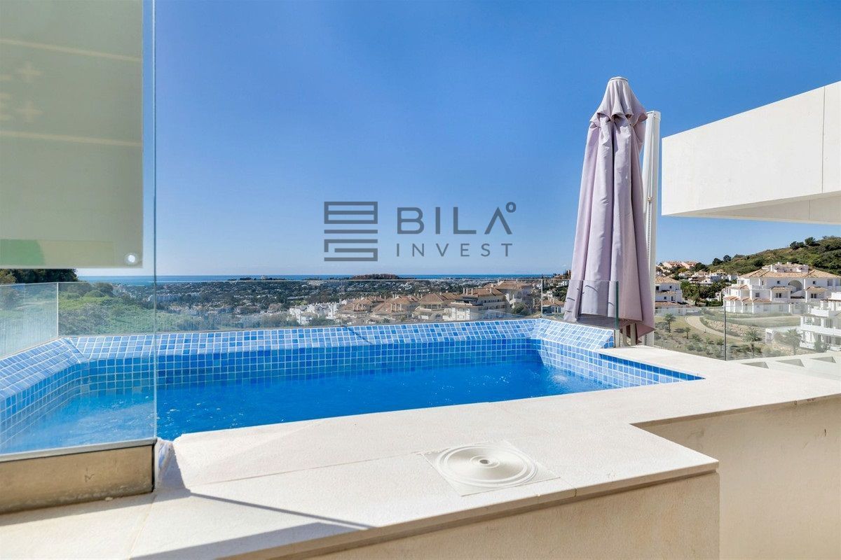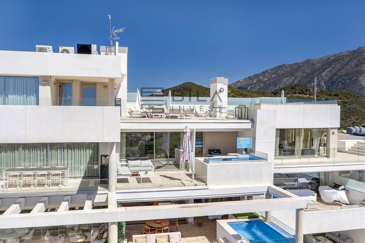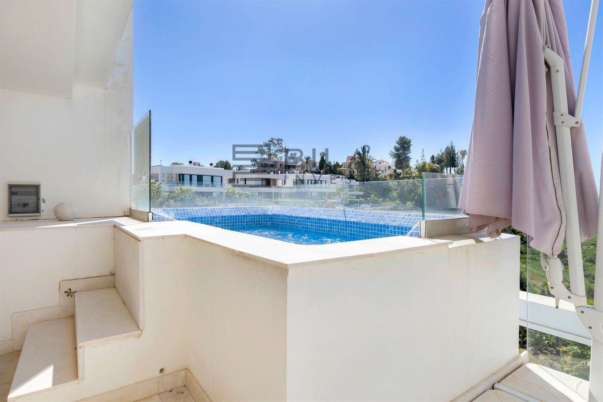 La impresionante zona diáfana de salón, comedor y cocina se integra a la perfección con una espectacular terraza cubierta de 34 m² con una piscina privada de 3 × 3 m, perfecta para recibir invitados o relajarse bajo el sol andaluz. Este complejo cerrado, rodeado de jardines tropicales y piscinas infinitas, ofrece tranquilidad, vistas panorámicas al mar y se encuentra a solo unos minutos del bullicioso Puerto Banús. Una oportunidad única para disfrutar de un refugio tranquilo con el glamour de Marbella a un paso. Construida con materiales de primera calidad y acabados impecables, rebosa elegancia, sofisticación y estilo moderno, lo que sin duda impresionará incluso al comprador más exigente.