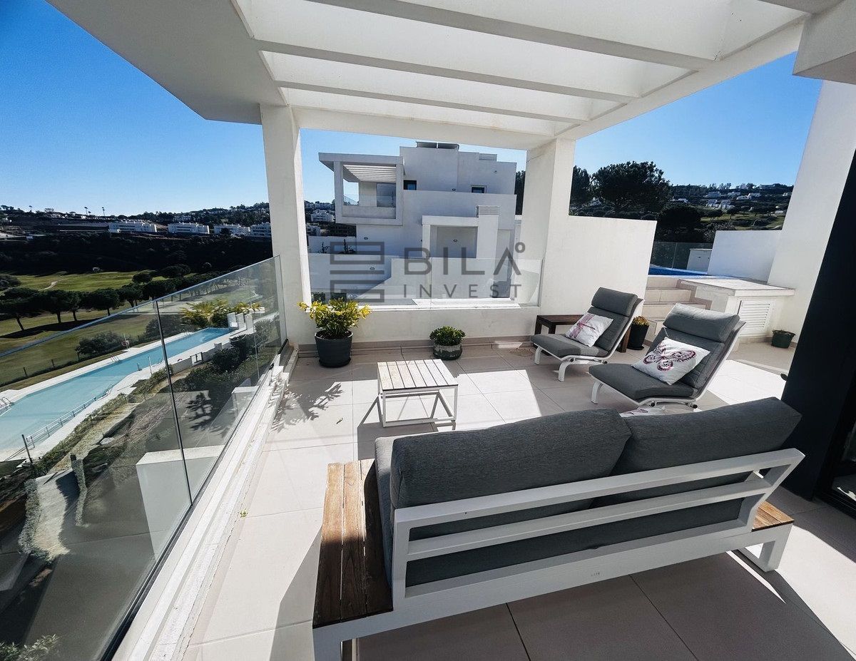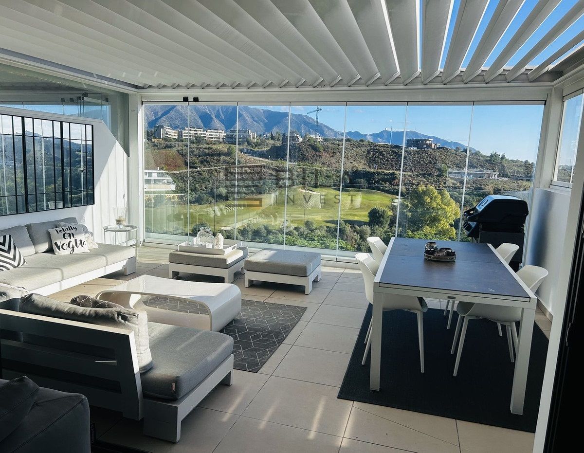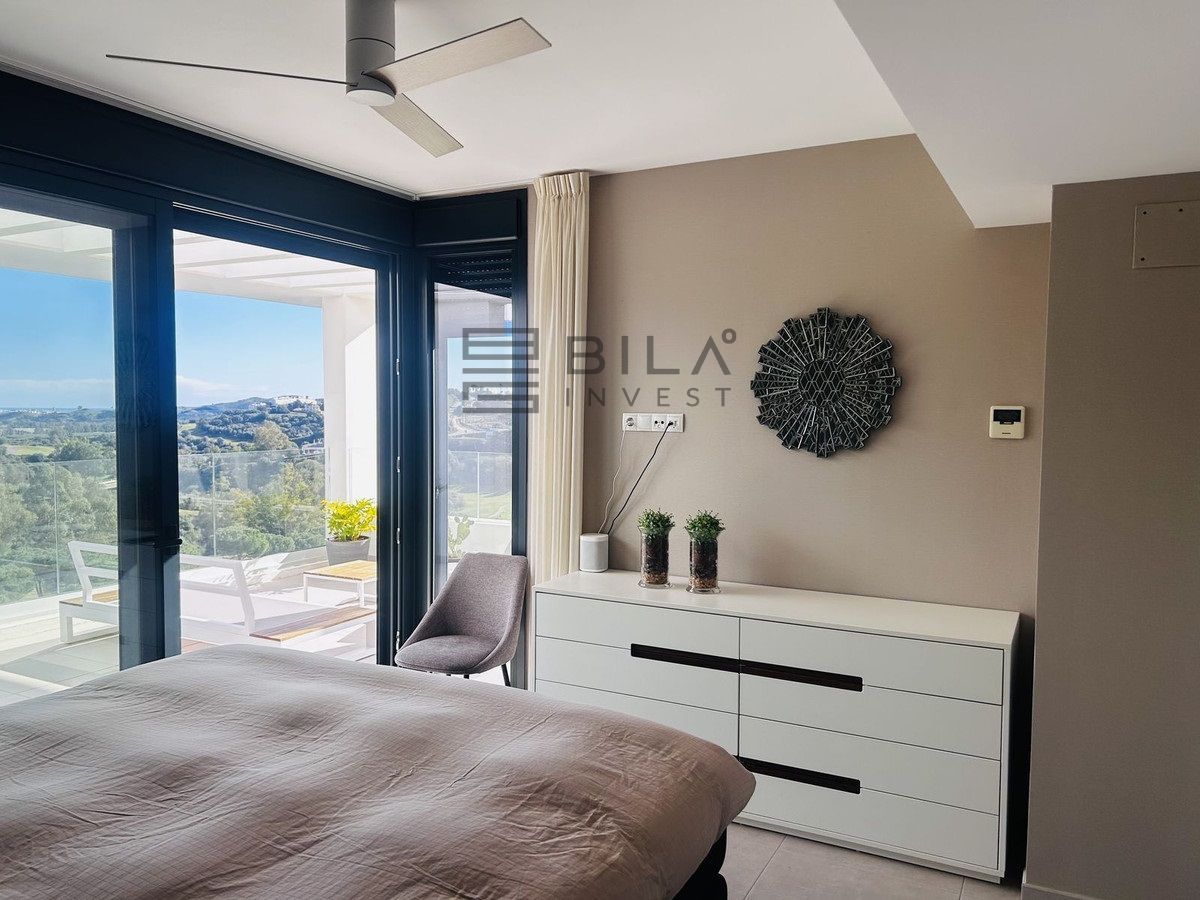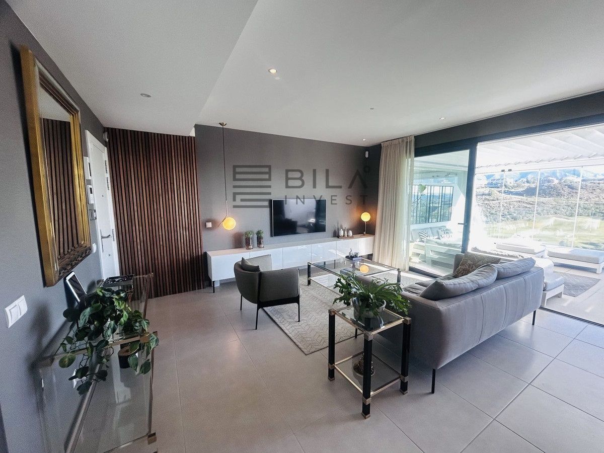 El ático está situado en primera línea del famoso campo de golf "Campo América" de La Cala Golf y ofrece impresionantes vistas panorámicas a las montañas, los campos de golf y el mar Mediterráneo. Se distribuye en 2 plantas. En la planta principal, el elegante salón-comedor se abre a una amplia terraza donde el amanecer se convierte en una obra maestra. La cocina abierta, totalmente equipada con electrodomésticos Bosch, está diseñada para comidas familiares y se complementa con prácticos armarios para utensilios. Dos dormitorios adicionales ofrecen comodidad y privacidad con impresionantes vistas al campo de golf y comparten el baño de invitados.