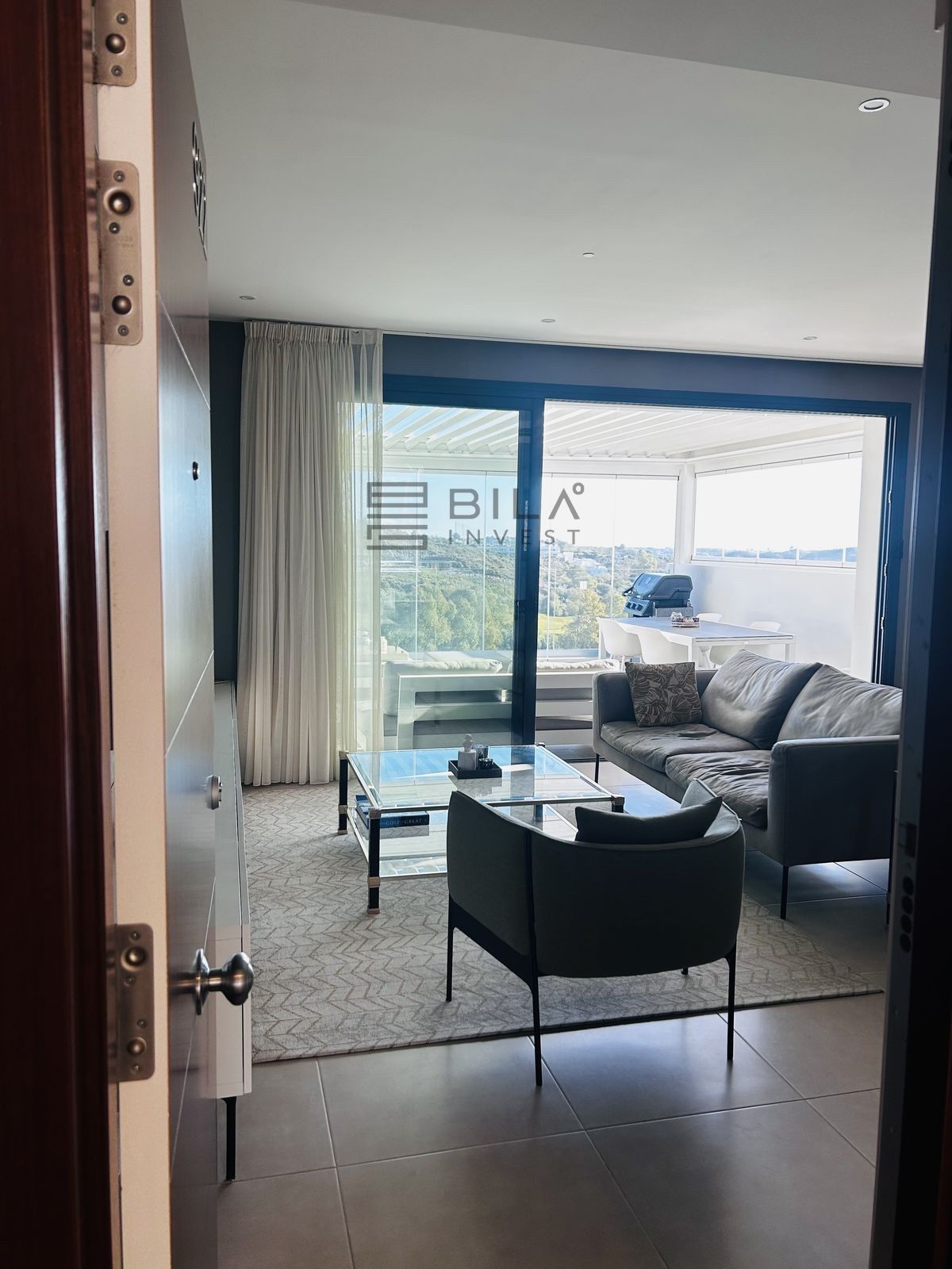 • Pérgola con cortinas de cristal y techo bioclimático con mando a distancia