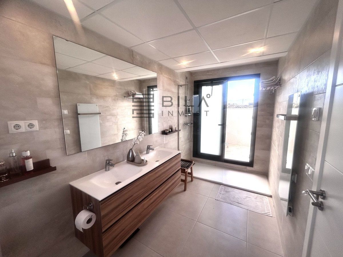 En la planta superior se encuentra el dormitorio principal con baño privado y ducha exterior privada adicional. Desde allí, suba al espacioso solárium y disfrute del sol todo el día. La terraza superior está dedicada al disfrute: un impresionante solárium privado con piscina privada donde podrá relajarse después de un día de golf.