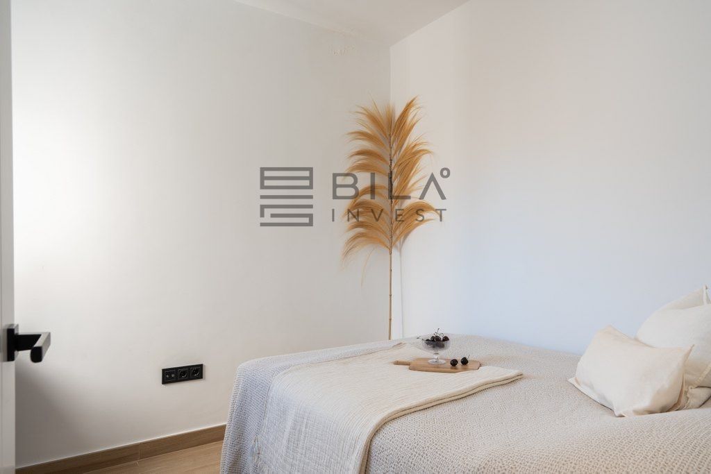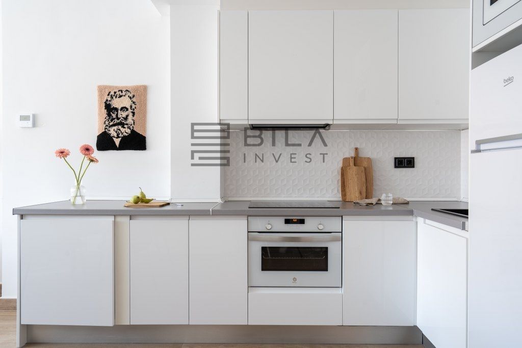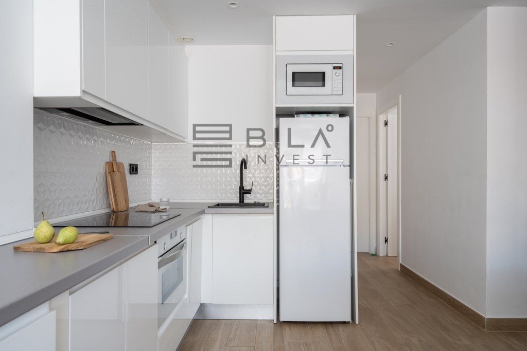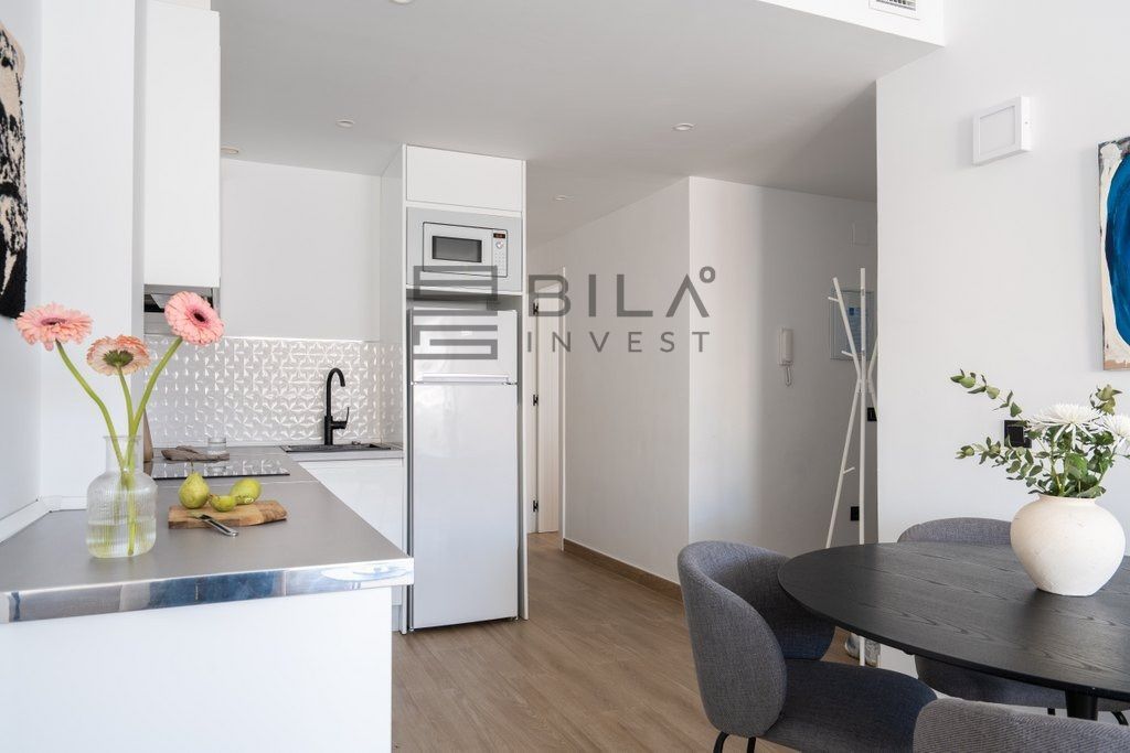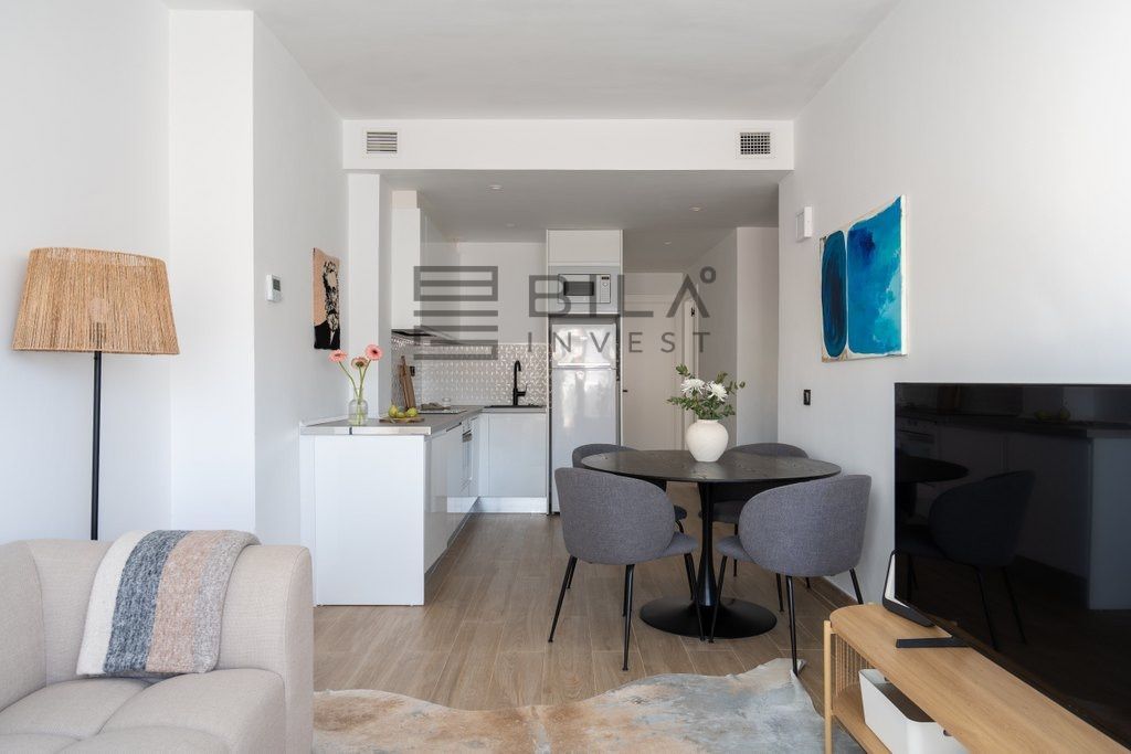La luz natural se derrama en todo el apartamento, mejorando la sensación fresca y contemporánea. La cocina bien equipada es práctica para la vida cotidiana, mientras que el diseño incluye dos cómodas habitaciones y un baño. Ambos dormitorios cuentan con amplios armarios empotrados.