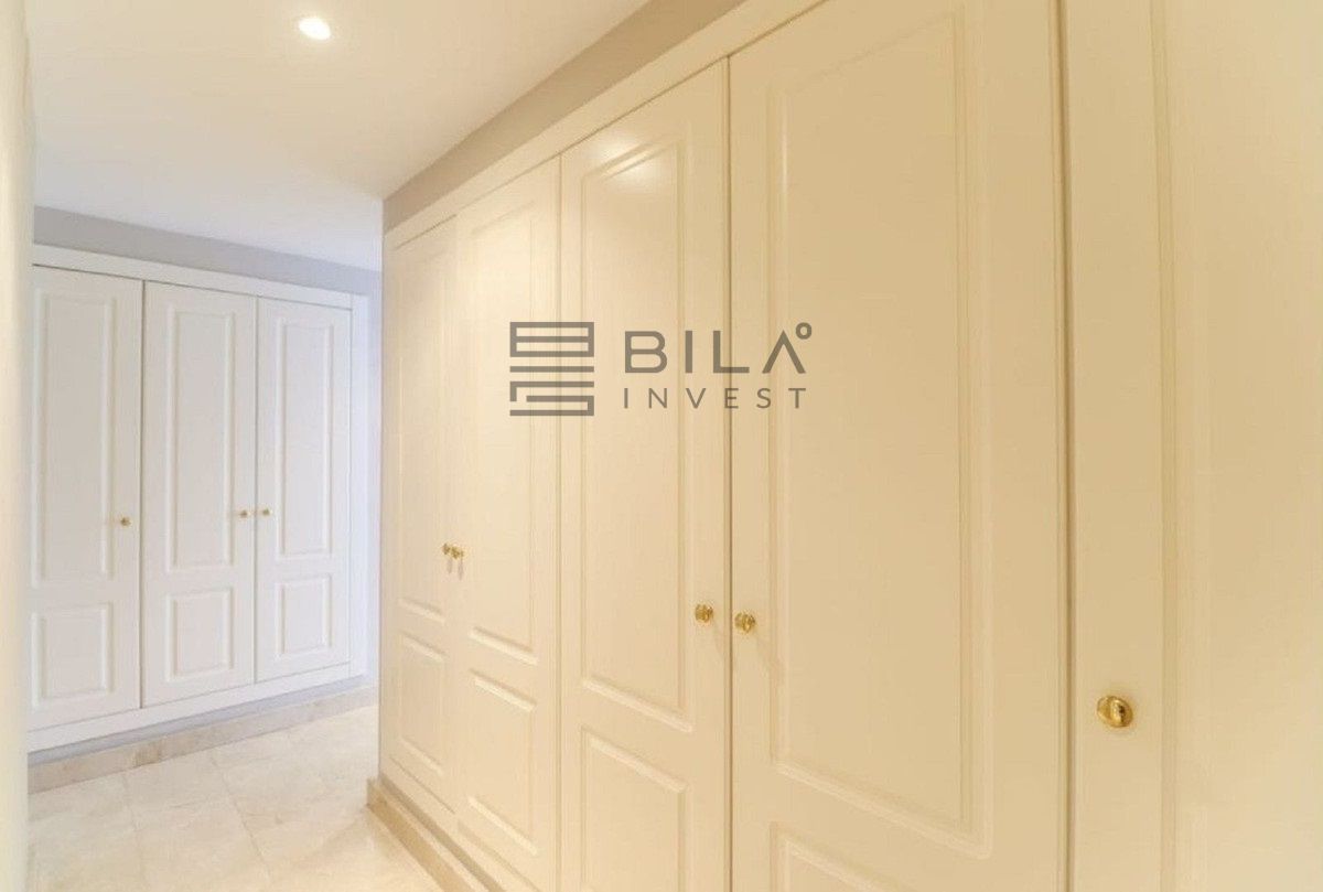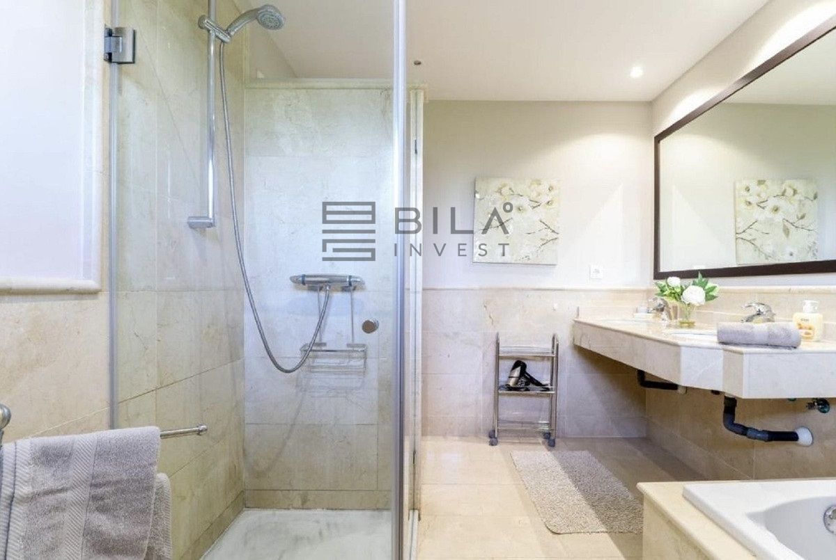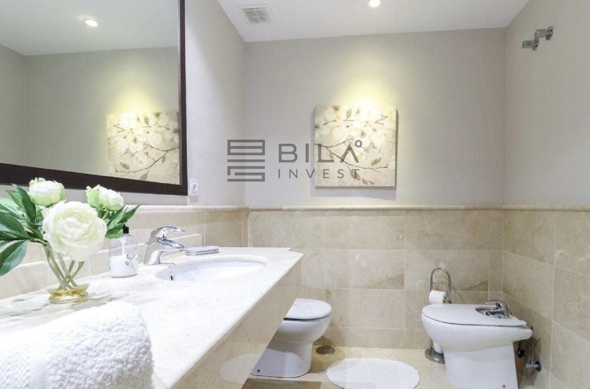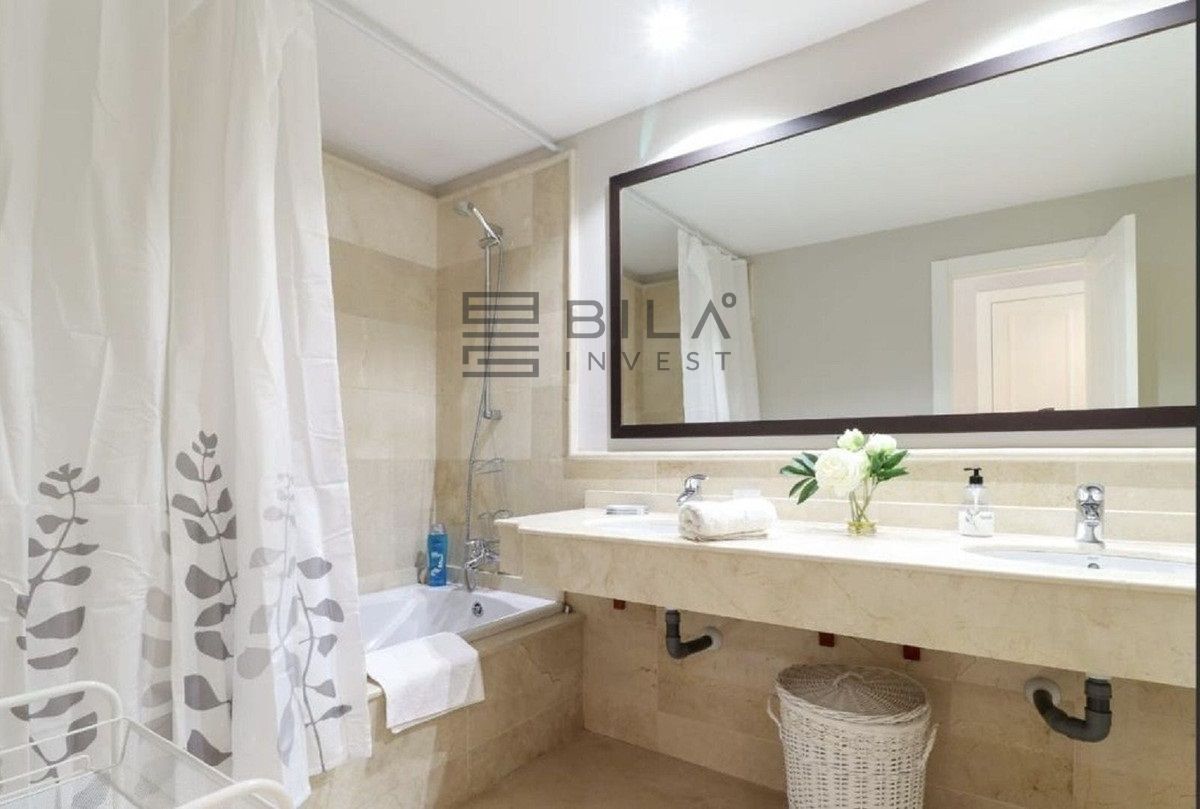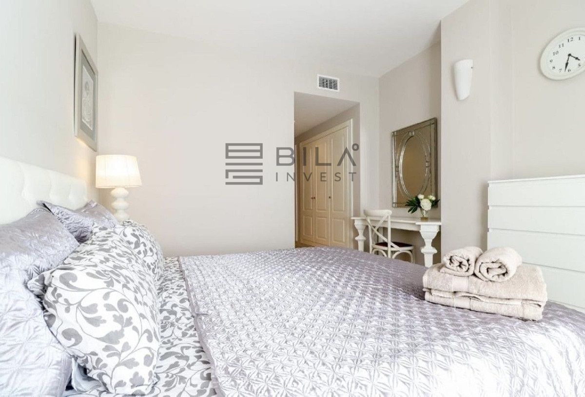 El salón es luminoso y espacioso. El apartamento dispone de dos dormitorios situados en extremos opuestos, lo que garantiza una excelente privacidad. Ambos dormitorios cuentan con baño en suite, bañera de hidromasaje y amplios armarios.
