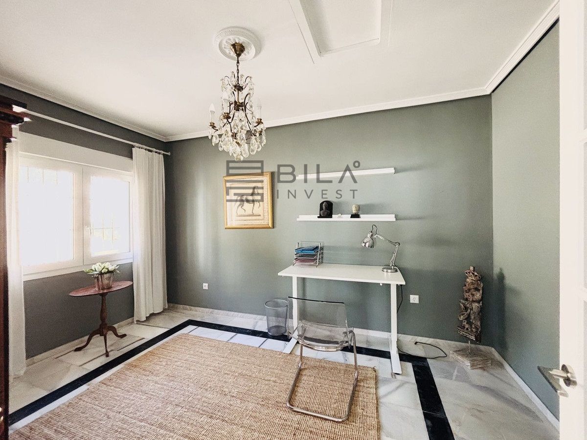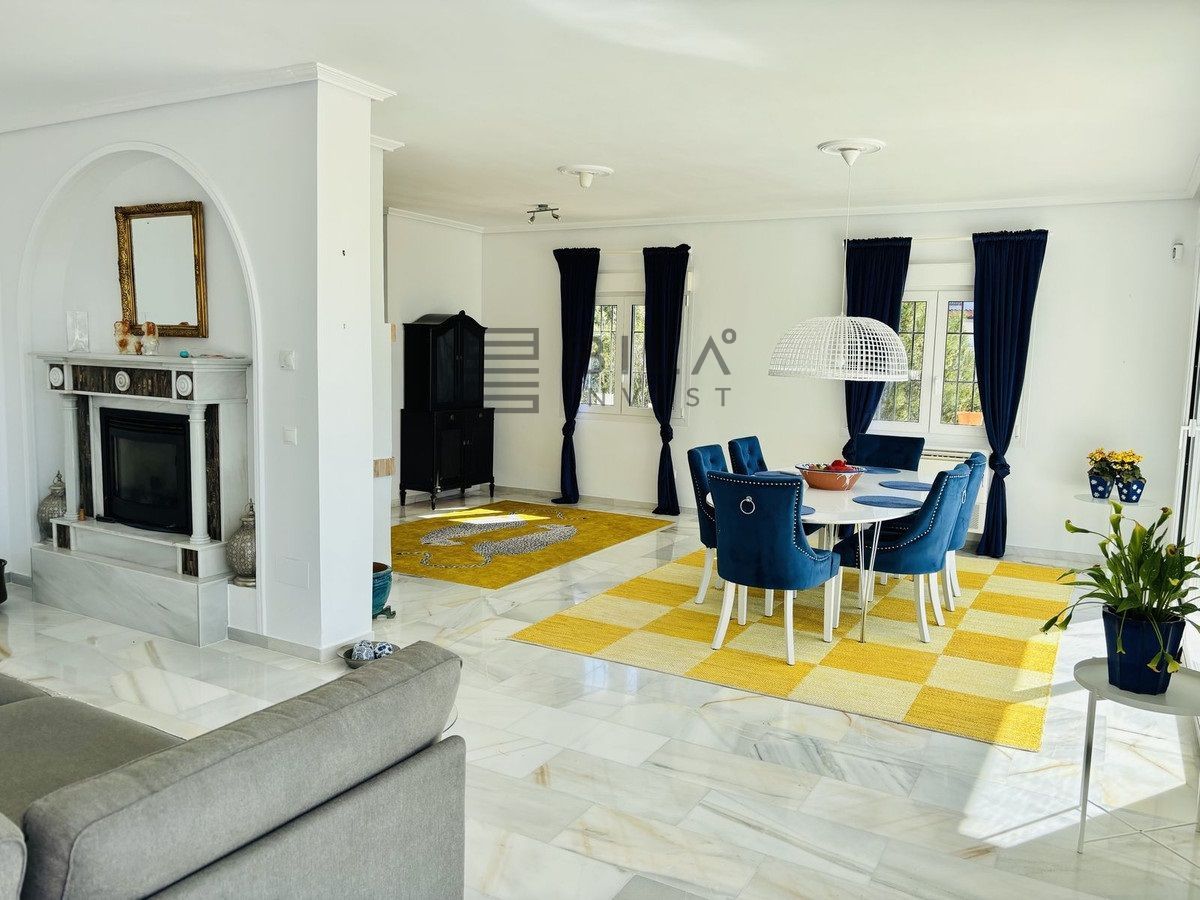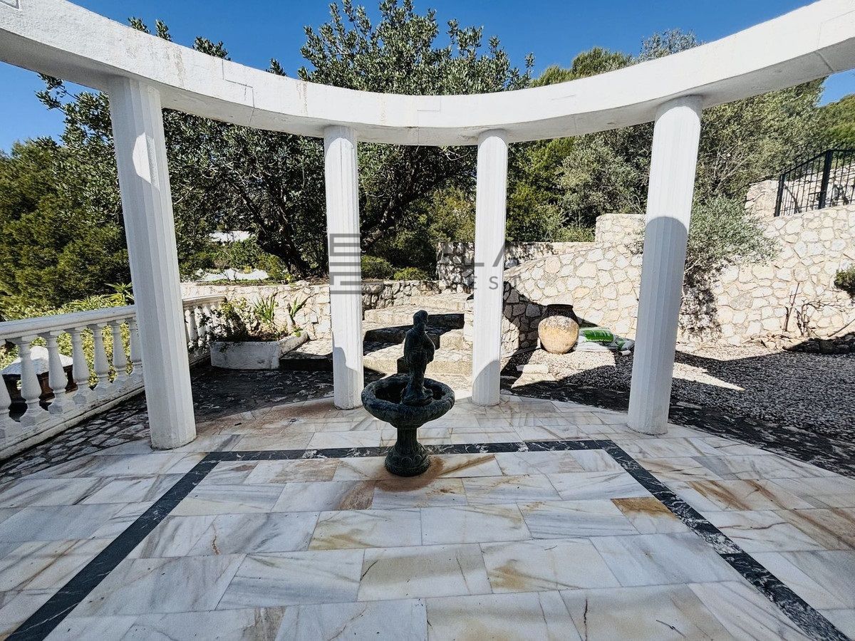 Las zonas exteriores son igualmente impresionantes, con acceso directo desde la terraza a través de escaleras exteriores que conducen a una gran piscina rodeada de un jardín impecablemente cuidado con olivos centenarios. El entorno es verdaderamente excepcional, ofreciendo vistas panorámicas y un ambiente perfecto para disfrutar del aire libre y recibir invitados. Además, la propiedad cuenta con un apartamento independiente para invitados con entrada privada.