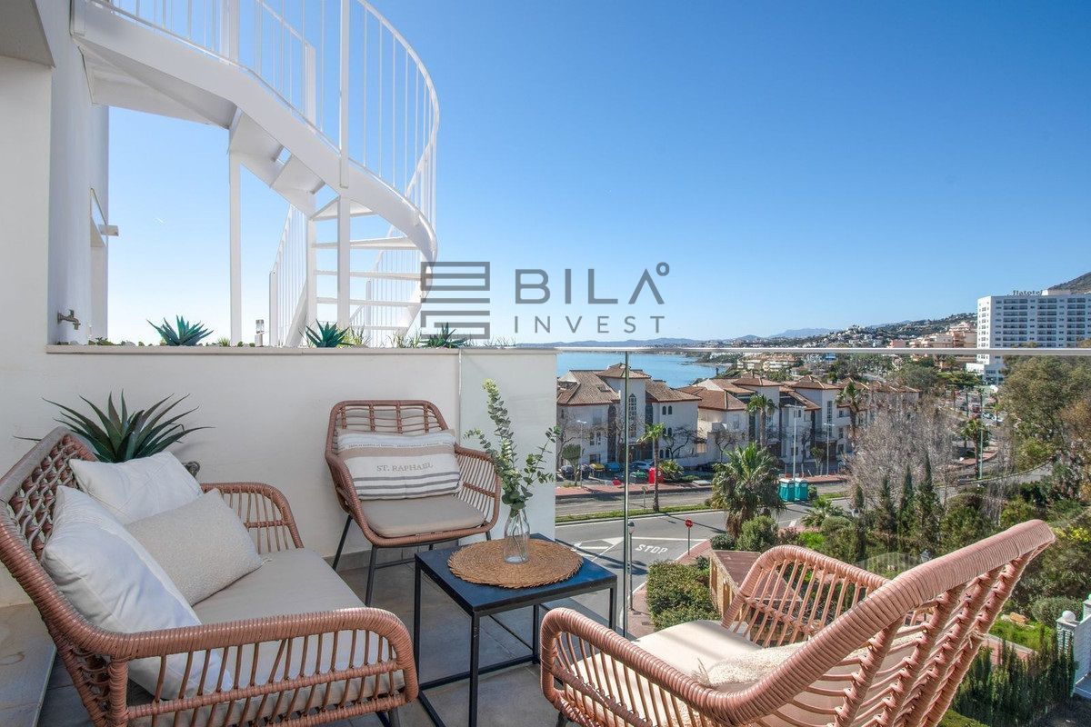 Ático en venta en Benalmádena, Málaga, en la exclusiva zona de Benalmádena Costa. Con 100 m2 construidos, ofrece tres habitaciones y tres baños, pensando en comodidad y funcionalidad para toda la familia. Distribución práctica con armarios empotrados, cocina amueblada y la vivienda totalmente amueblada, lista para entrar a vivir. Dispone de ascensor, trastero, aire acondicionado y servicios de agua y luz ya disponibles para uso inmediato.