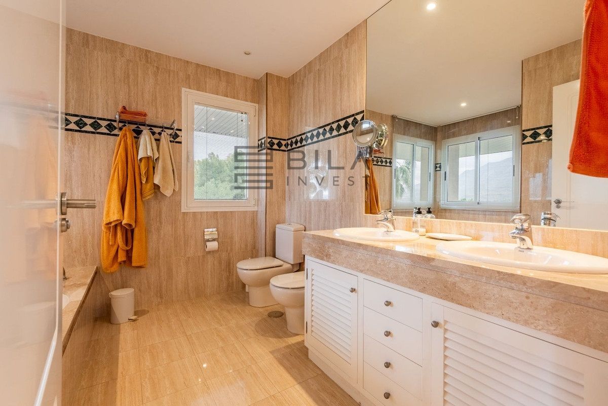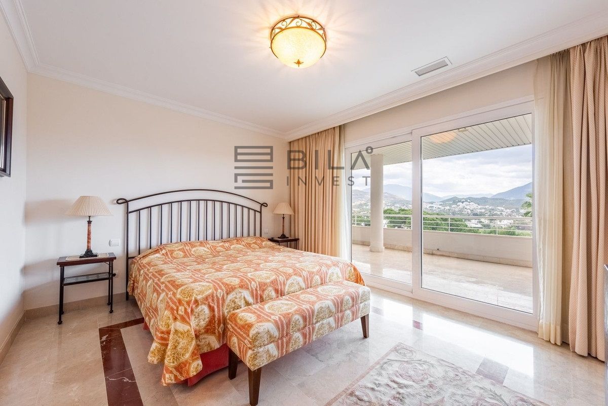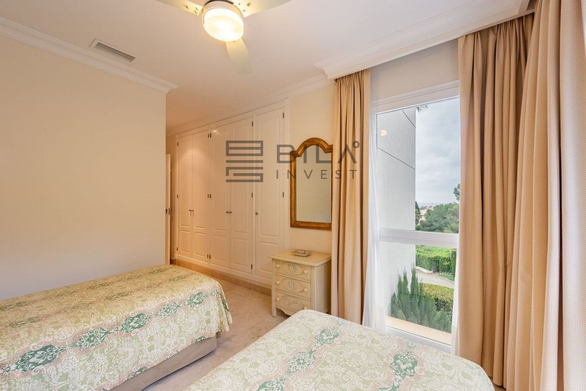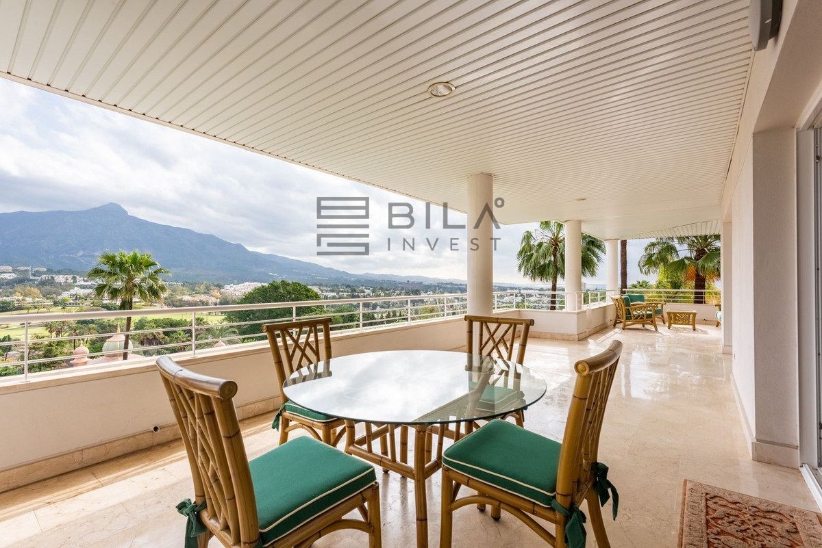 La amplia terraza envolvente es una característica sobresaliente, ya que brinda sol de mañana—típico de La Corniche—además de una codiciada orientación sur, asegurando sol hasta bien entrada la tarde. Desde la terraza, se puede disfrutar de cautivadoras vistas panorámicas sobre el Valle del Golf, con la emblemática montaña La Concha como telón de fondo, así como vistas abiertas que se extienden hasta el mar Mediterráneo, visibles desde el salón y todos los dormitorios.