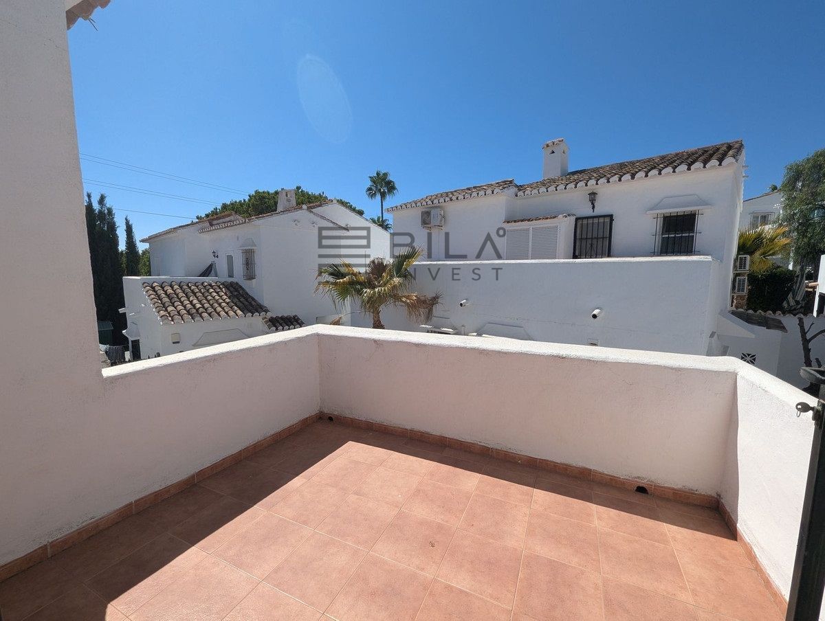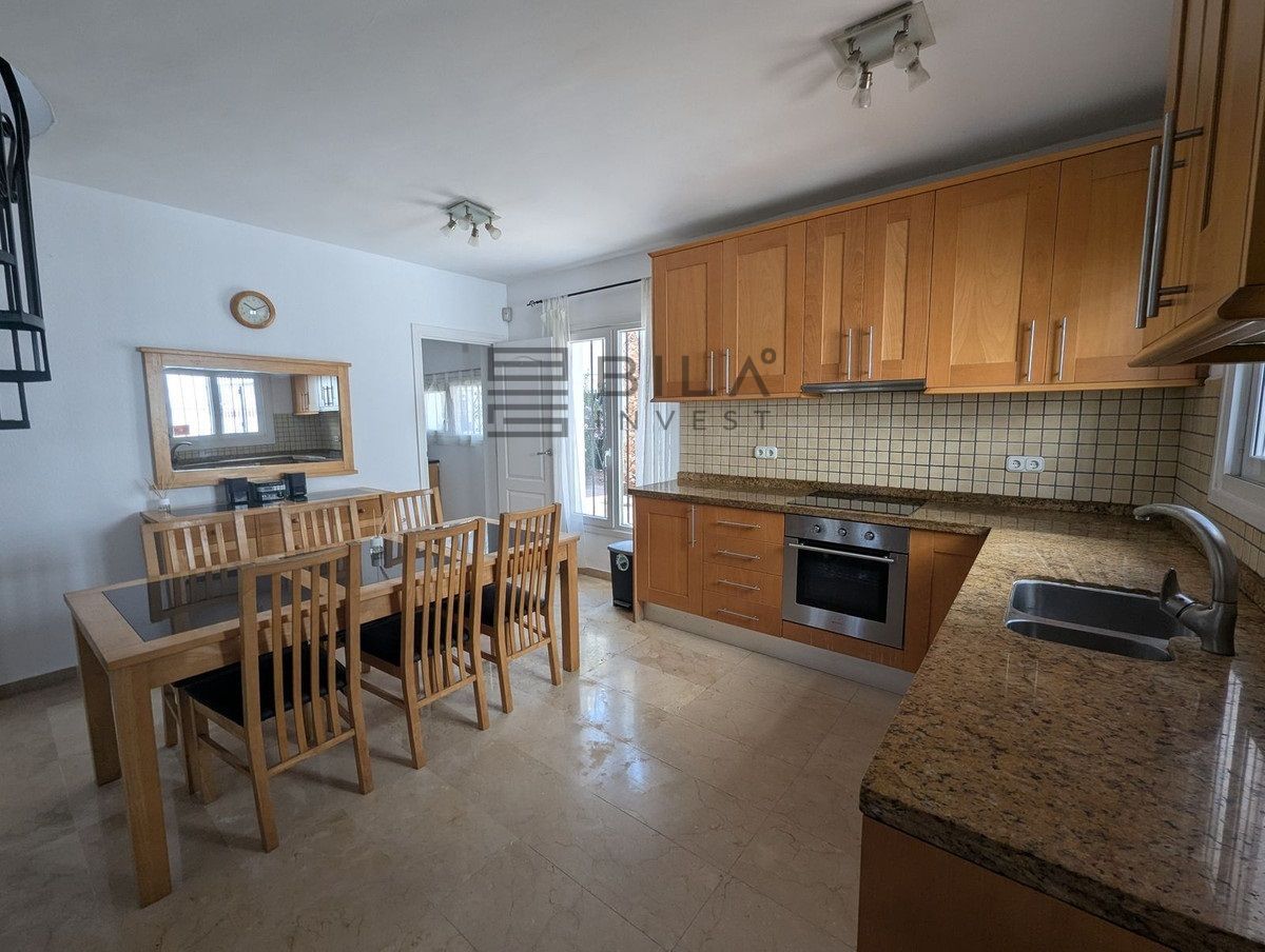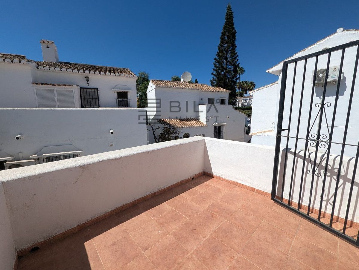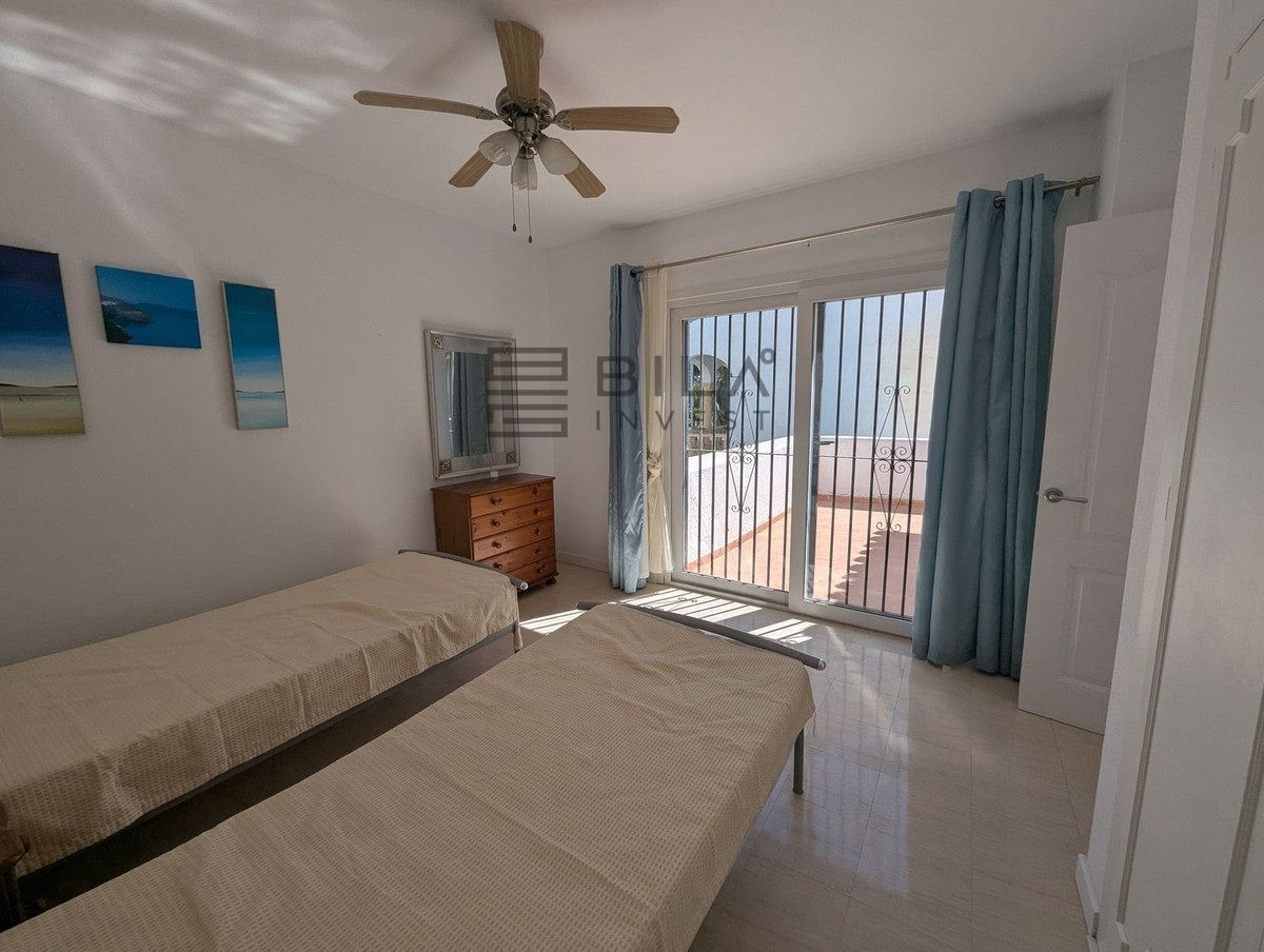 La casa se distribuye en dos plantas y ofrece tres amplios dormitorios y dos baños. Dos de los dormitorios de la planta superior dan a una terraza privada con preciosas vistas a los jardines comunitarios, la piscina e incluso al mar Mediterráneo.