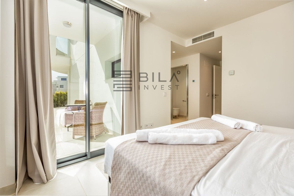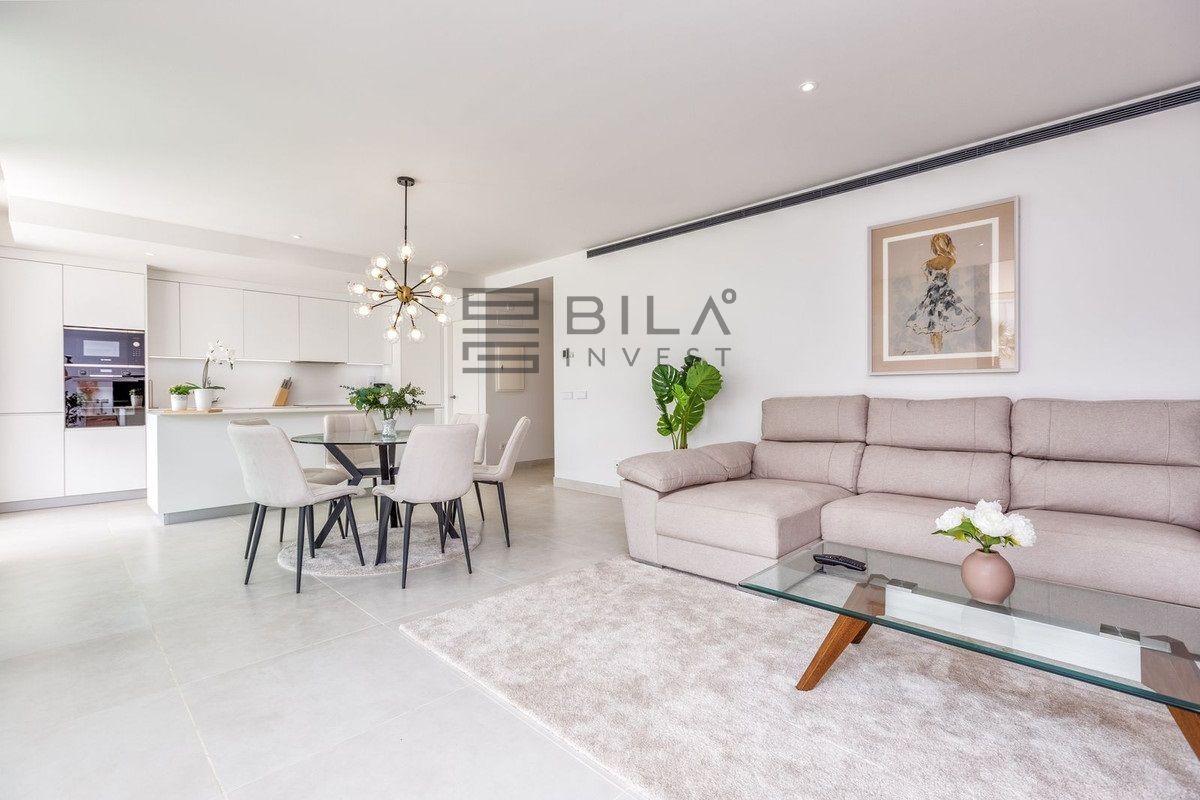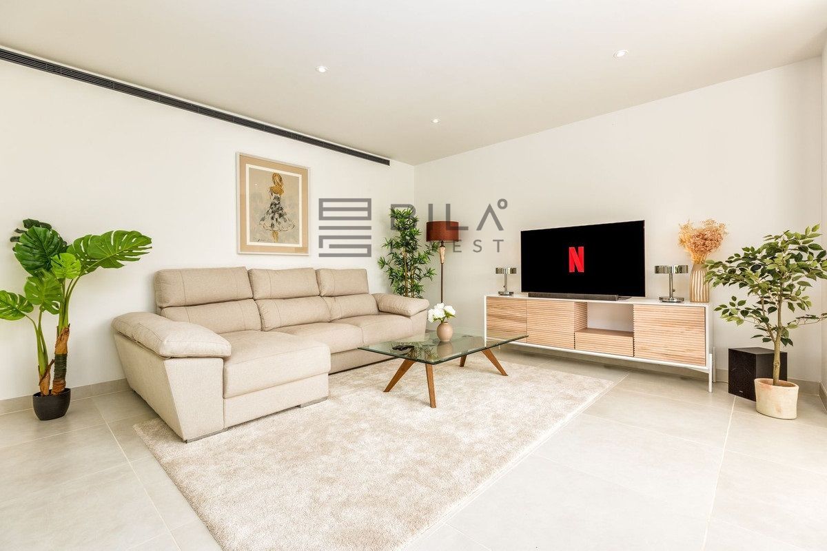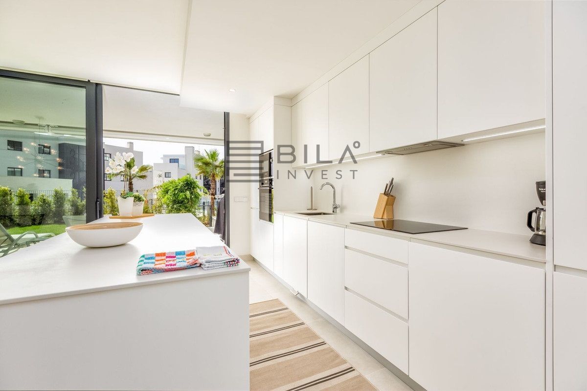 El apartamento cuenta con un acogedor salón, una cocina totalmente equipada ideal para preparar comidas y un jardín privado de 29 metros cuadrados, perfecto para relajarse o recibir invitados al aire libre. También incluye dos terrazas: una de 45 metros cuadrados y otra de 39 metros cuadrados, ofreciendo amplio espacio exterior para cenar, descansar o disfrutar de la brisa mediterránea.
