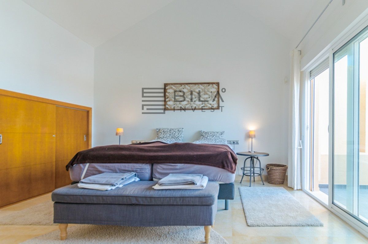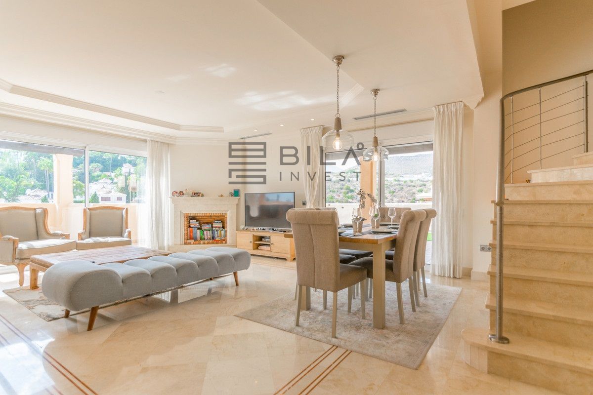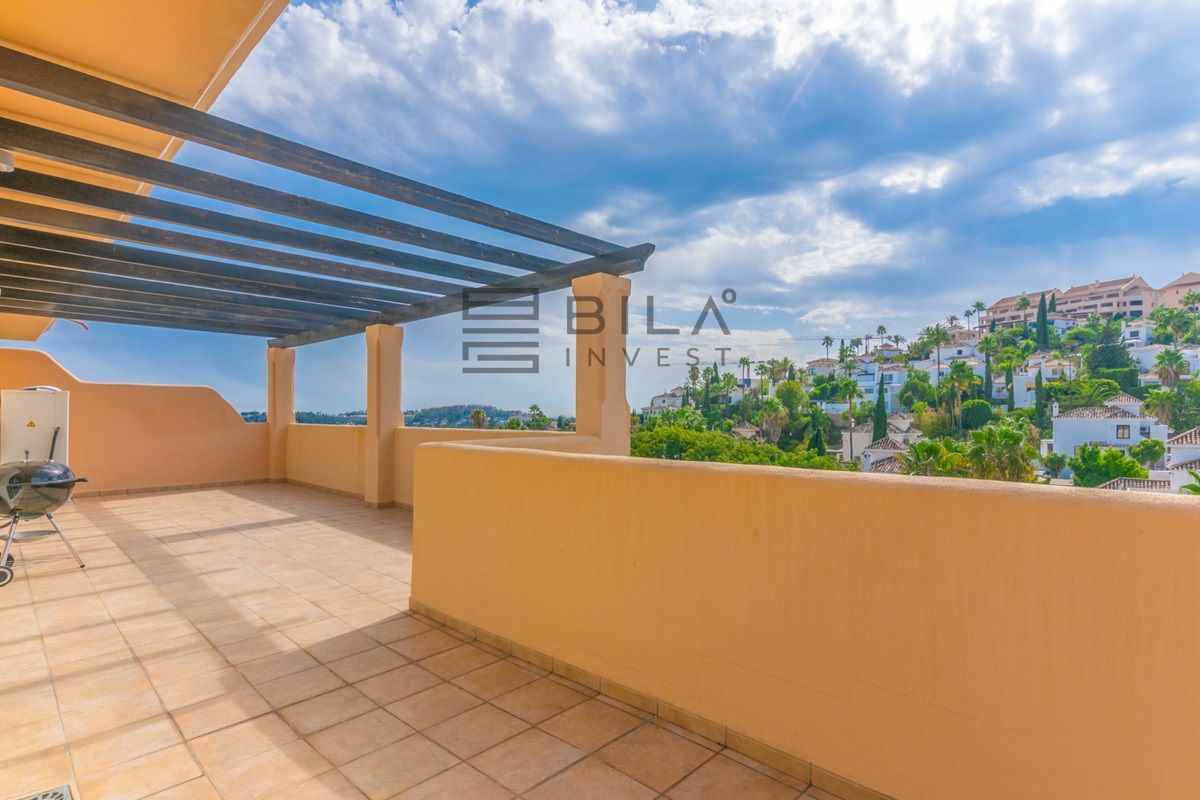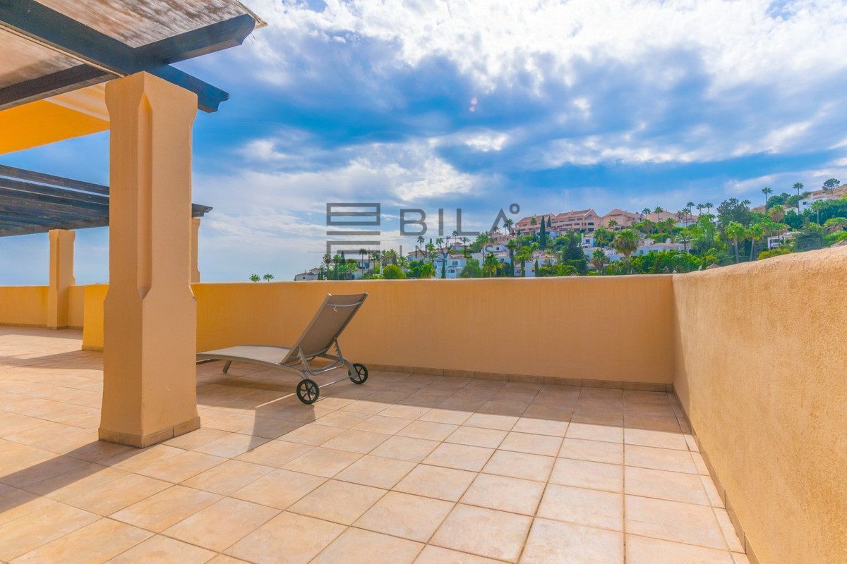 Este ático dúplex único de 3 dormitorios y 3 baños es sin duda el tipo de propiedad que muchos clientes exclusivos están esperando para salir al mercado. Esta impresionante unidad tiene básicamente todo lo que desea de una propiedad de alta calidad como que, un comedor muy grande y sala de estar con chimenea, una cocina moderna de planta abierta con un aseo y lavadero, una increíble terraza de 100m2 con unas bonitas vistas abiertas a la montaña, vistas parciales al mar y vistas a la piscina, un amplio y luminoso dormitorio doble con baño en suite y acceso directo a la terraza principal masiva. Todo solo en la planta principal y en la planta superior se encuentran otros 2 dormitorios muy amplios ambos ensuite y con terraza privada con impresionantes vistas al mar.