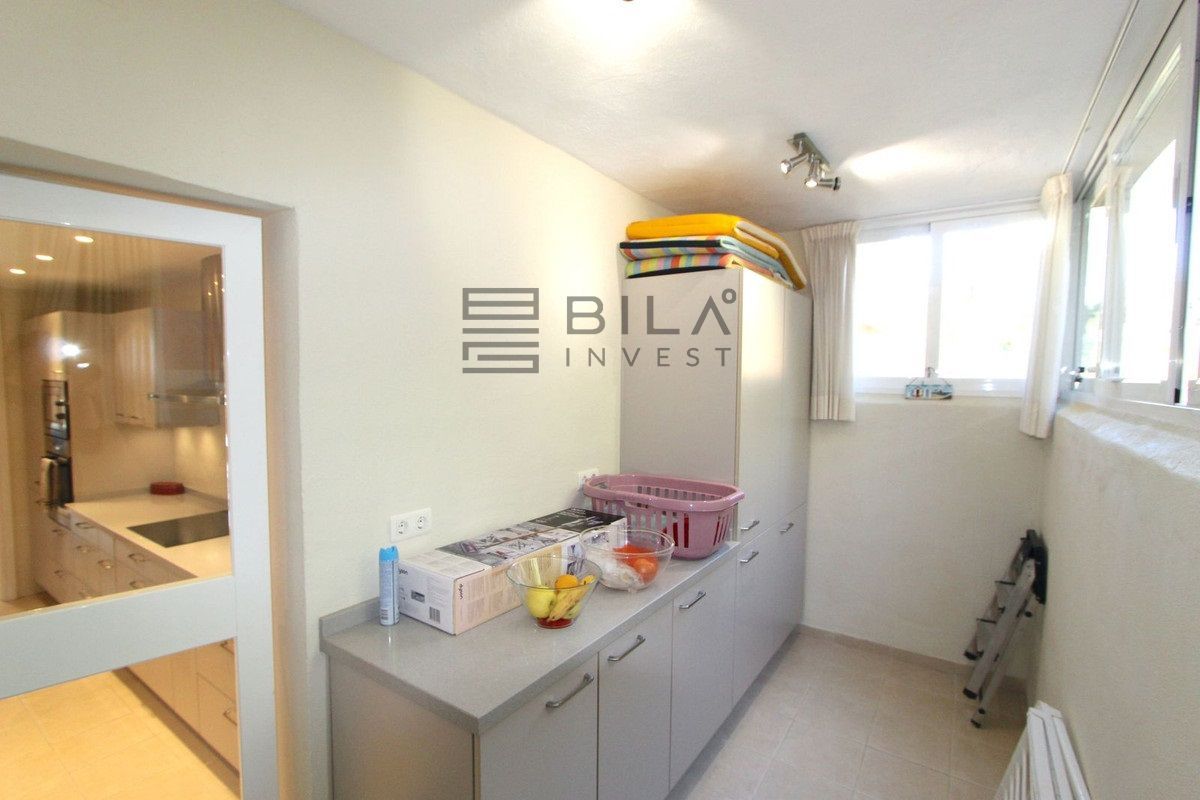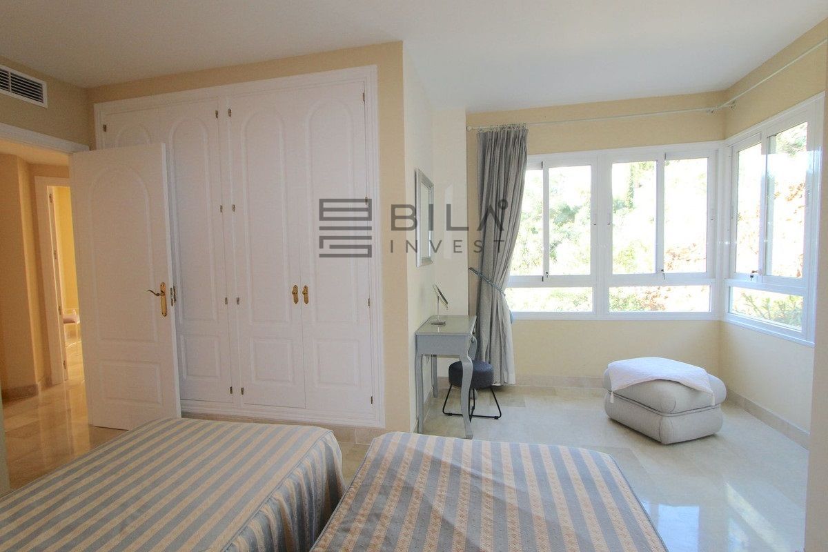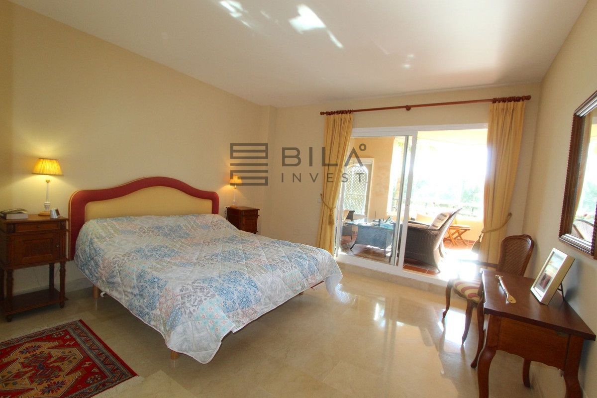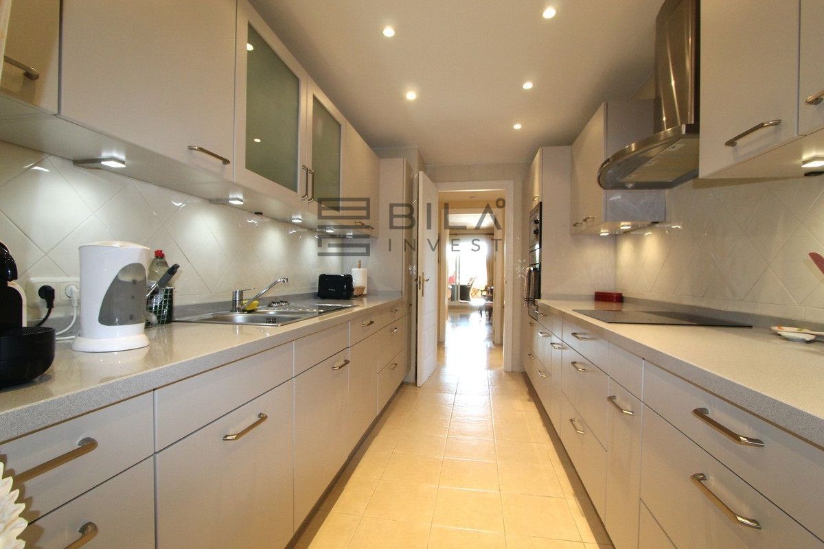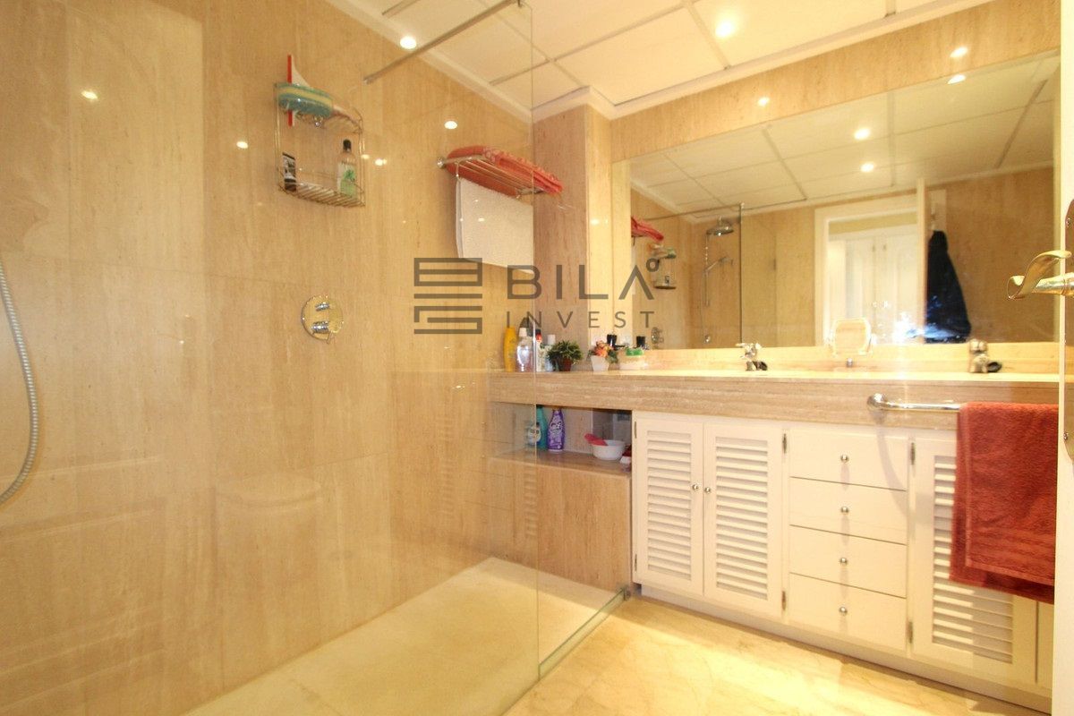 El apartamento cuenta con 3 amplios dormitorios y 2 baños, un amplio salón-comedor con acceso a la terraza orientada al este, con azulejos de cerámica, cortinas de cristal y vistas parciales al mar. Ambos baños, uno de ellos en suite, disponen de duchas a ras de suelo con cabezal de lluvia.