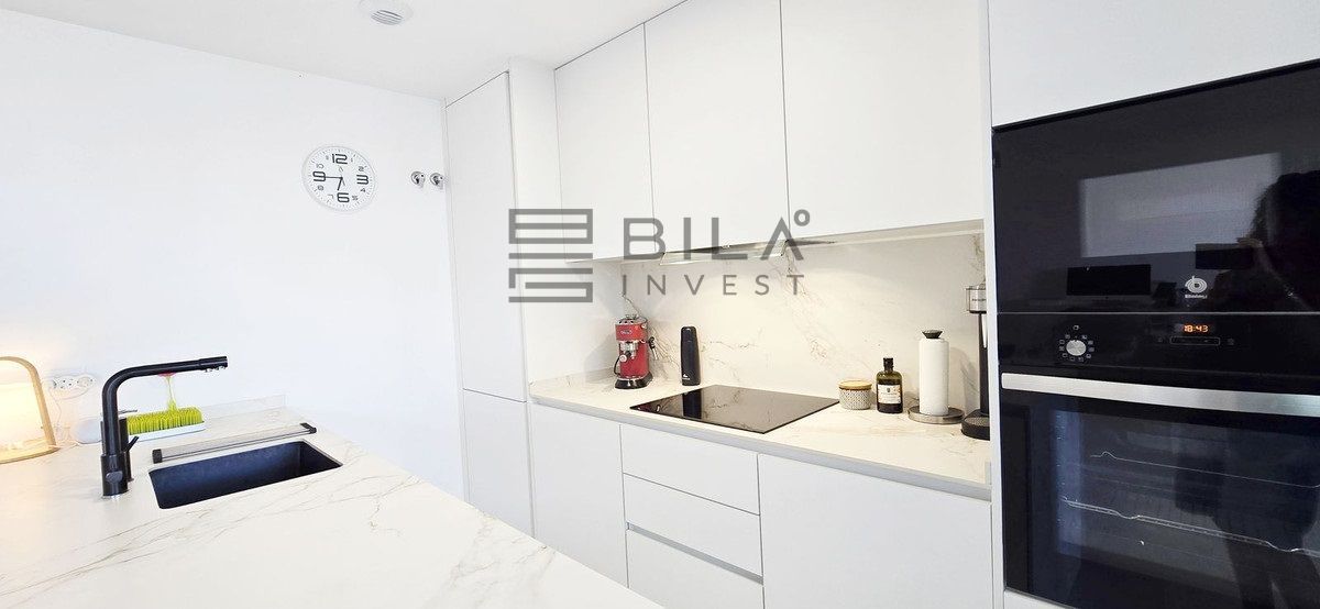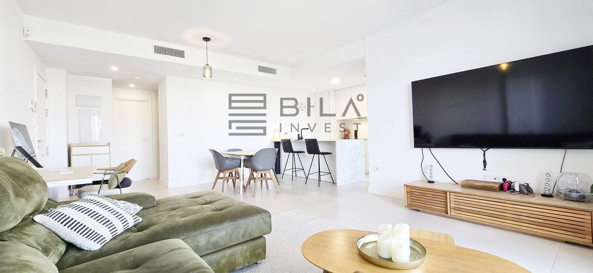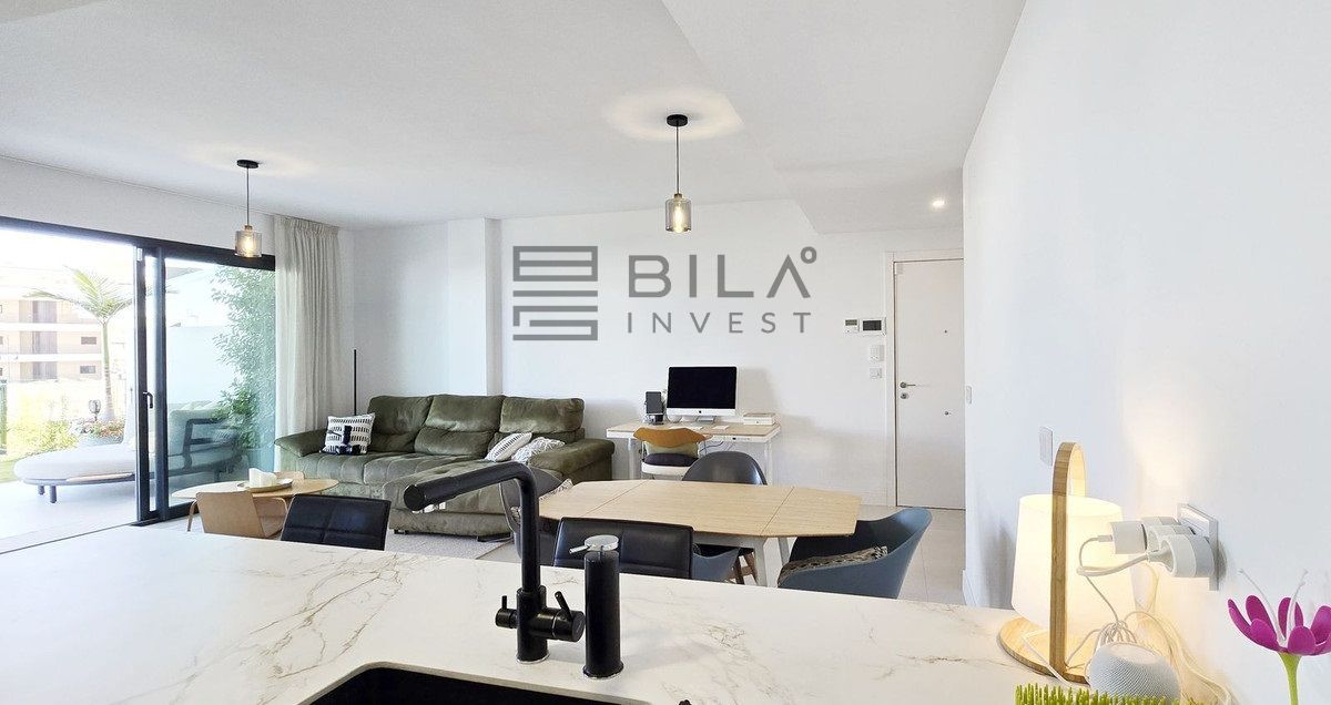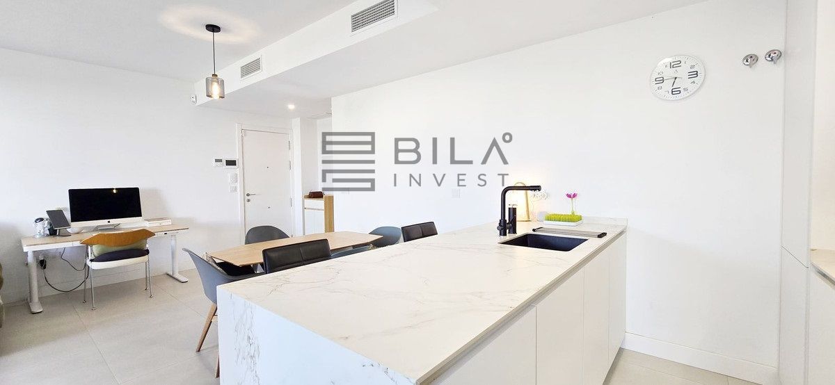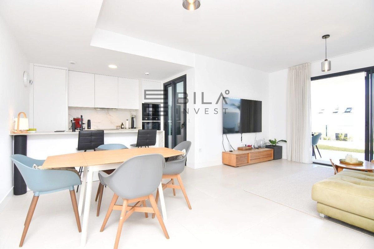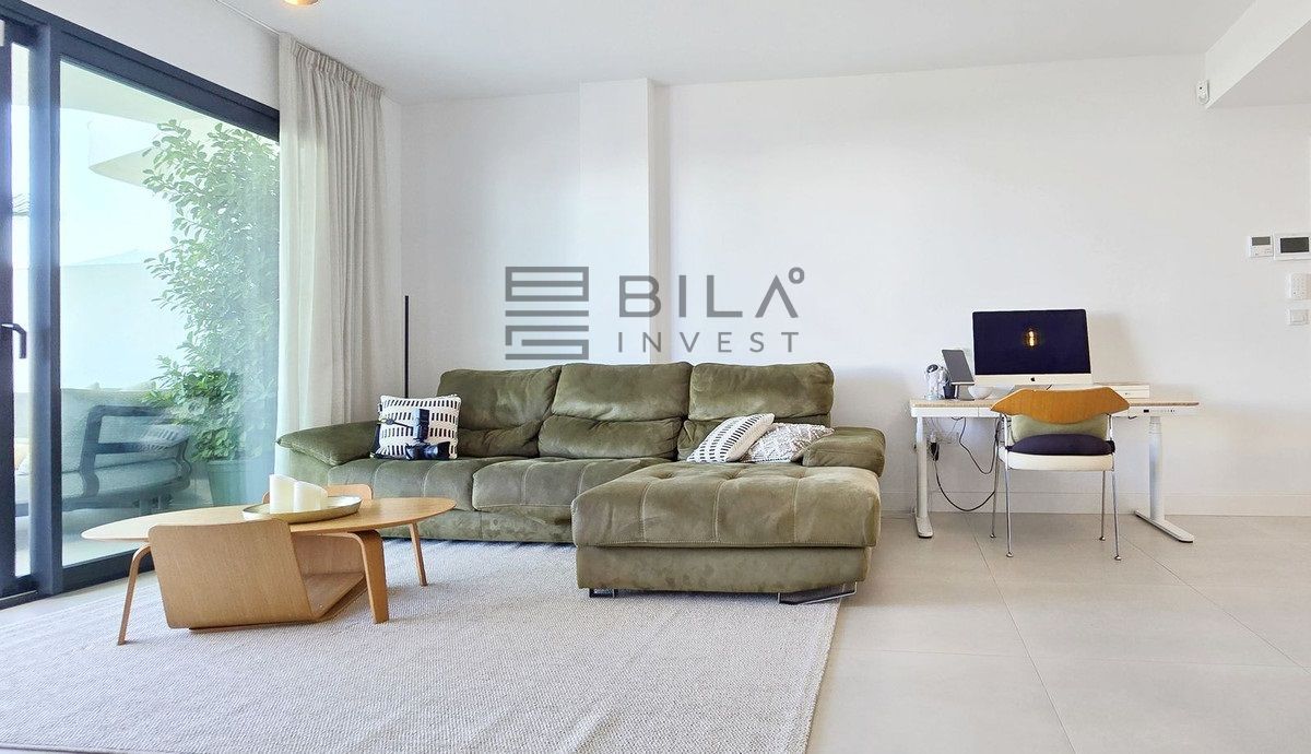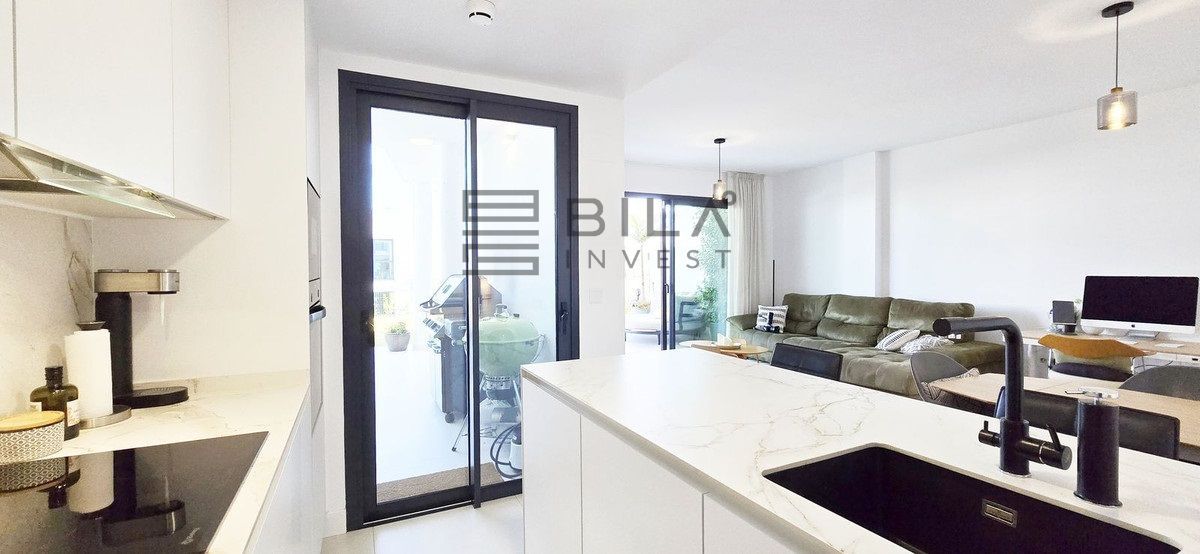 El luminoso salón con cocina abierta se conecta con la terraza y la zona de barbacoa, ideal para disfrutar del clima mediterráneo los 365 días del año. La cocina, con diseño contemporáneo y ventanal panorámico, también da acceso directo al exterior, aportando luz y amplitud a todo el espacio.