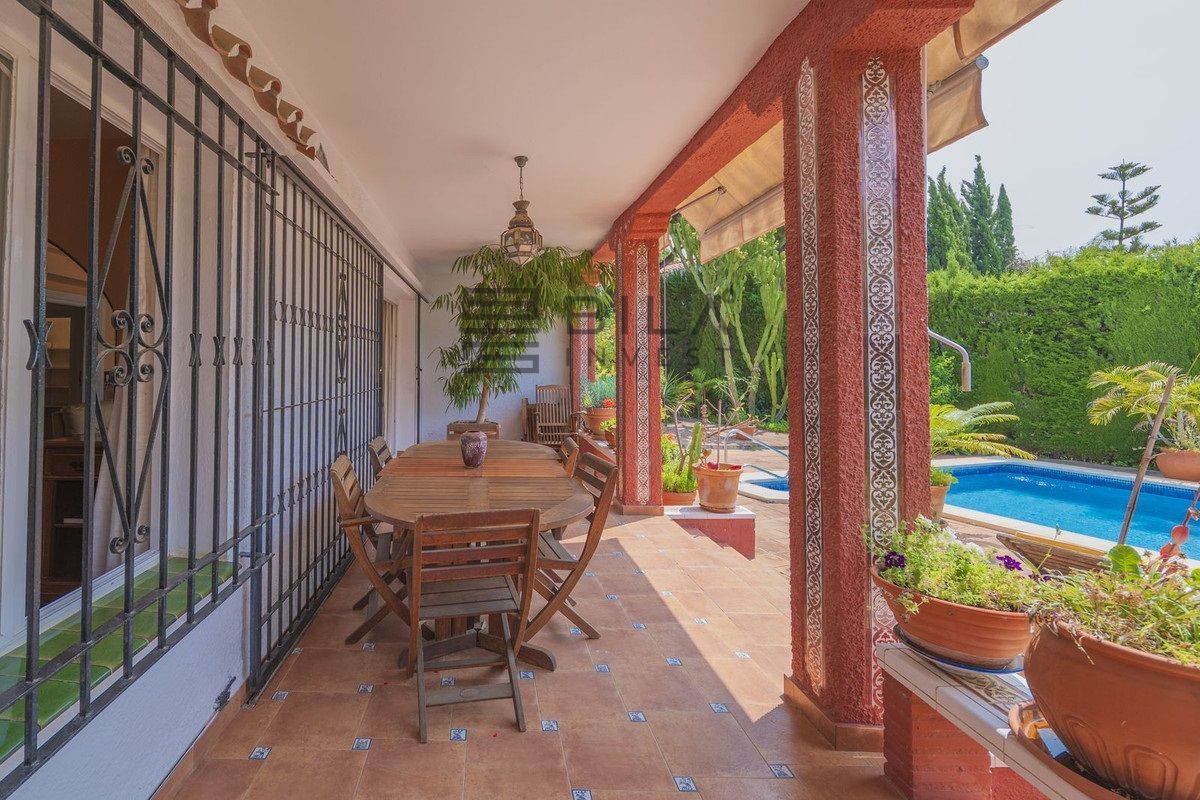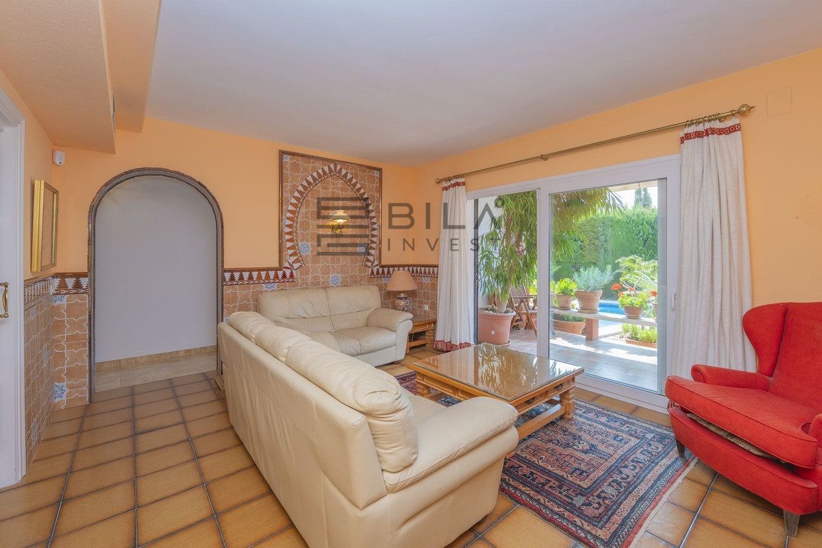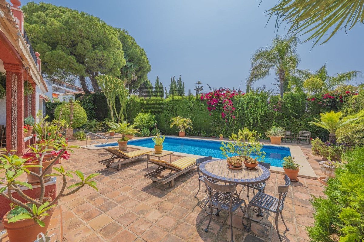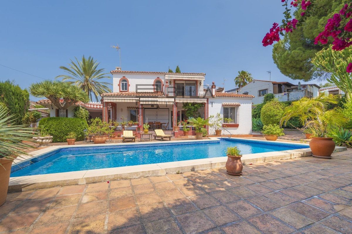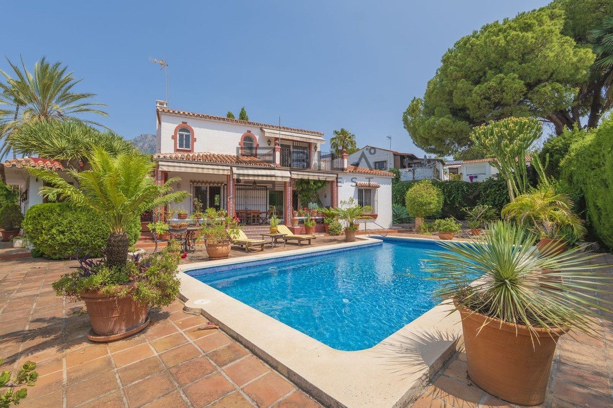 Estupendo Chalet independiente en la reconocida y consolidada zona residencial de El Mirador de Marbella. Una casa hecha para el disfrute y descanso, cerca de colegios, supermercados y con la A7 a un minuto en coche. De marcado estilo andaluz y sobre una parcela de 823m2, esta propiedad ofrece cocina con entrada independiente, un baño y el acogedor salón con comedor adyacente y salida a la terraza cubierta de 20m2; además dos dormitorios que comparten un baño completo con Sauna. En la planta superior, el dormitorio principal, con sala de estar, despacho y otra terraza, ésta descubierta, de 10m2 desde la que se divisa el mar. Este encantador Chalet con acento presume, finalmente, de un coqueta piscina y zona de barbacoa convenientemente situada y cubierta. Garage privado también cubierto. Encanto y detalles para esta propiedad con una situación envidiable, en zona urbana con variedad de servicios y oportunidades de ocio a mano, y aún así, con la tranquilidad y discreción que uno espera en una casa de este nivel.