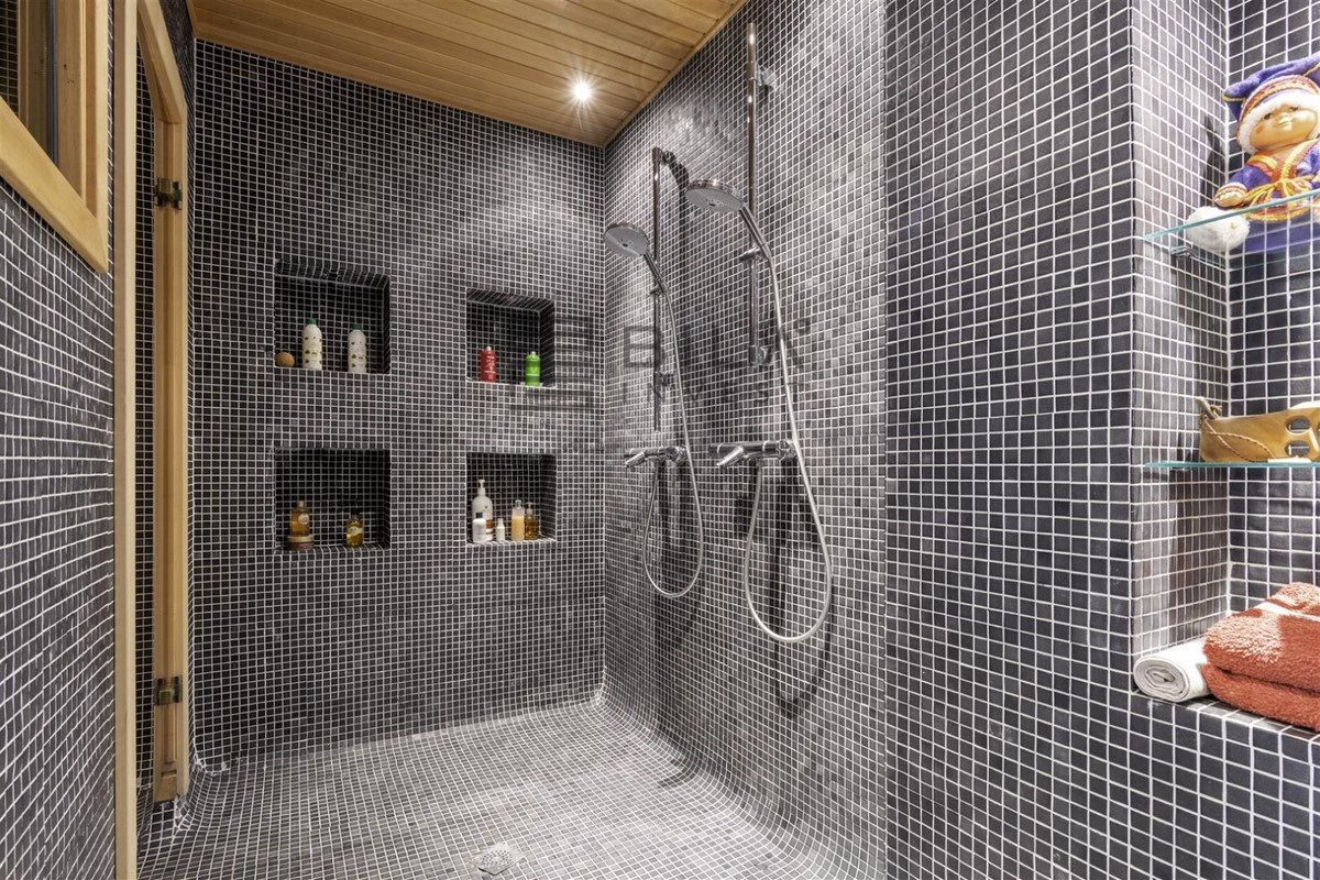 Alicatados de Porcelanosa, griferias Grohe, piedra Portuguesa en los pasillos.