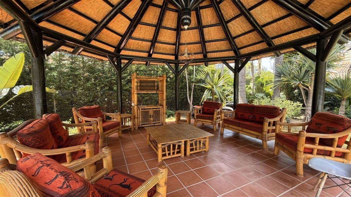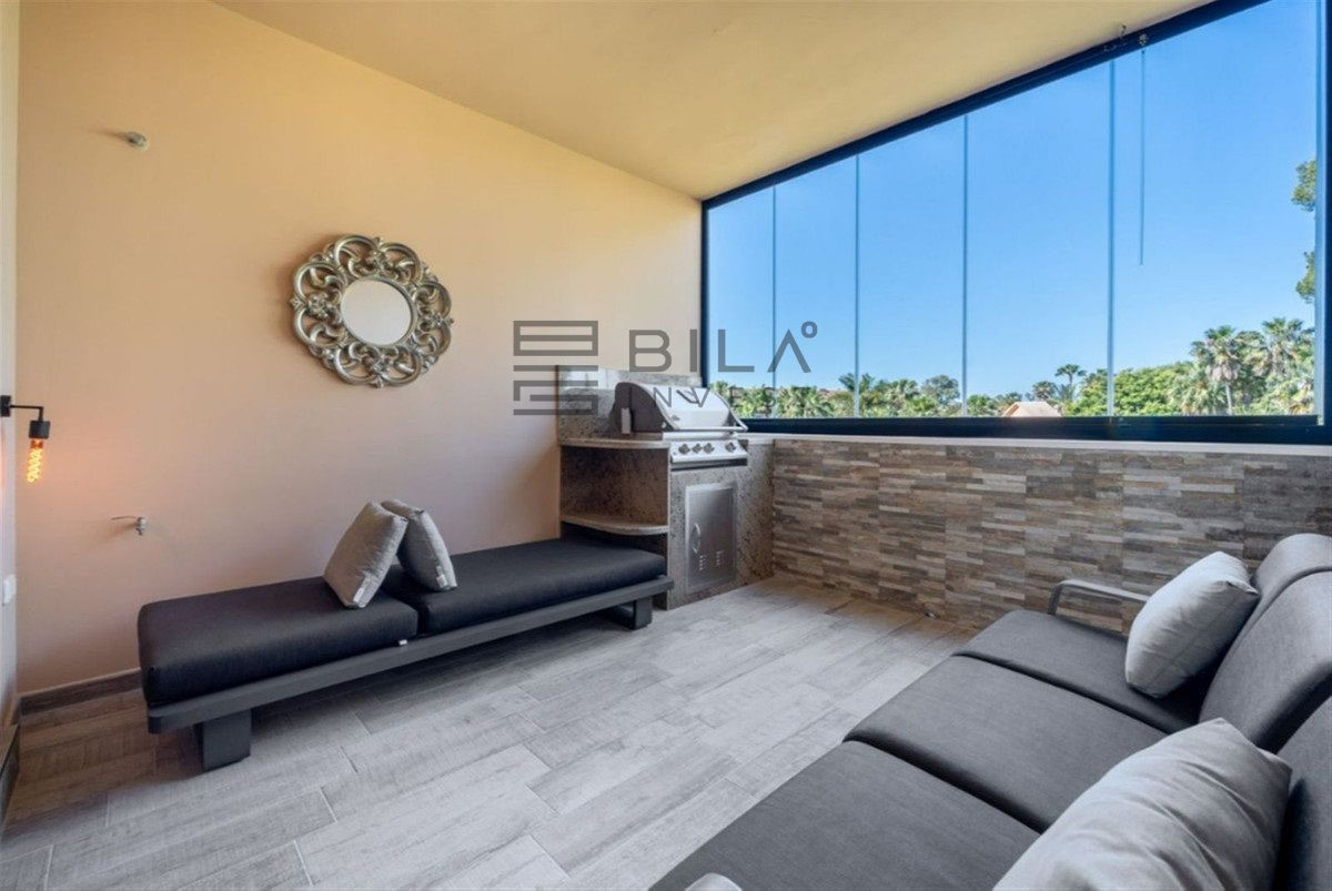 El apartamento es luminoso y espacioso, con una amplia terraza orientada al suroeste con vistas a los hermosos jardines tropicales. Las cortinas de cristal permiten disfrutar de la terraza durante todo el año. Esta cuenta con zonas de comedor y de relax, además de una barbacoa de obra, perfecta para disfrutar al aire libre.