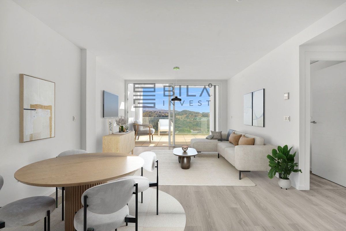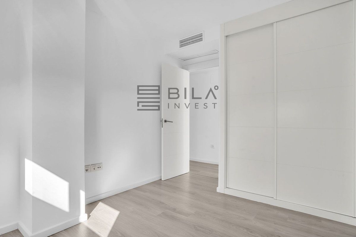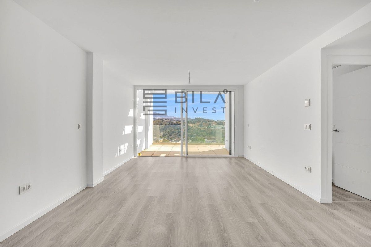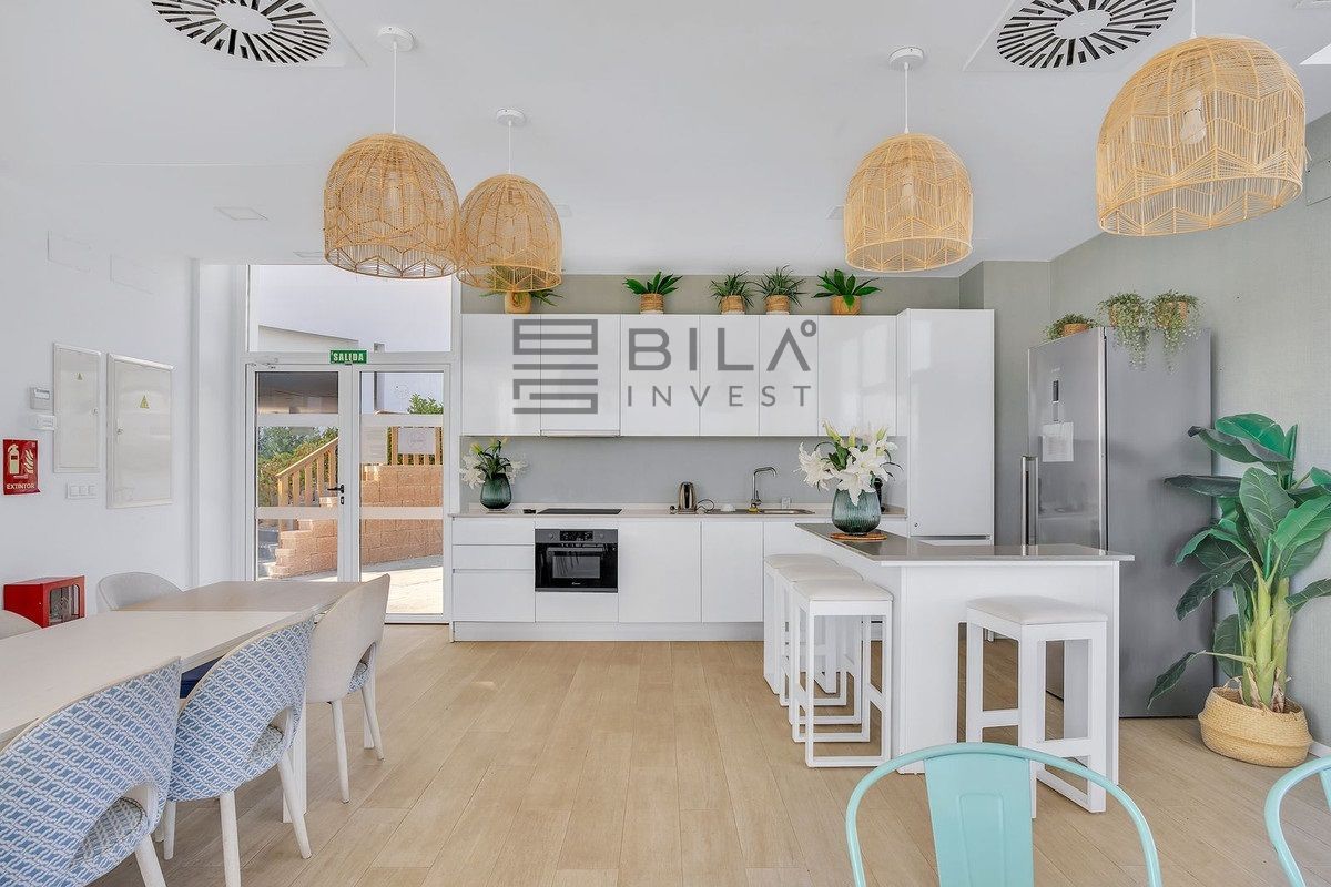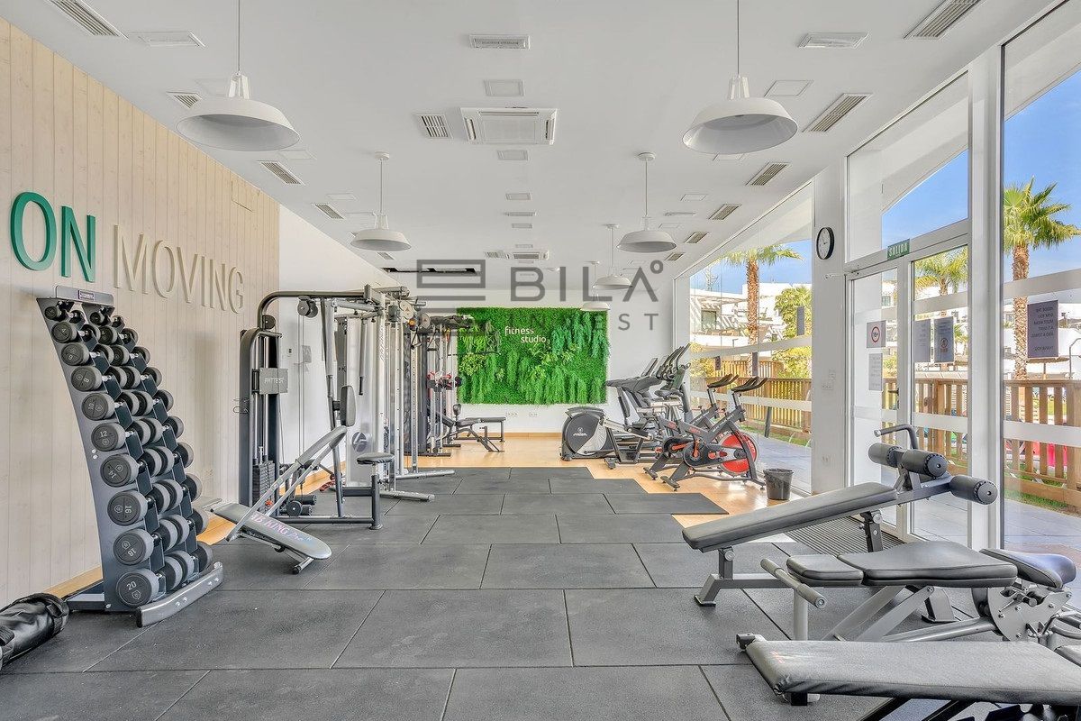 Este moderno apartamento de nueva construcción de 3 dormitorios y 2 baños se ubica en la primera línea dentro de la urbanización, en la fila inferior, lo que lo sitúa más cerca de la entrada peatonal. Su ubicación lo convierte en uno de los pocos con vistas panorámicas al mar sin ningún edificio enfrente, lo que garantiza privacidad y sin posibilidades de futuros desarrollos que bloqueen las vistas.
