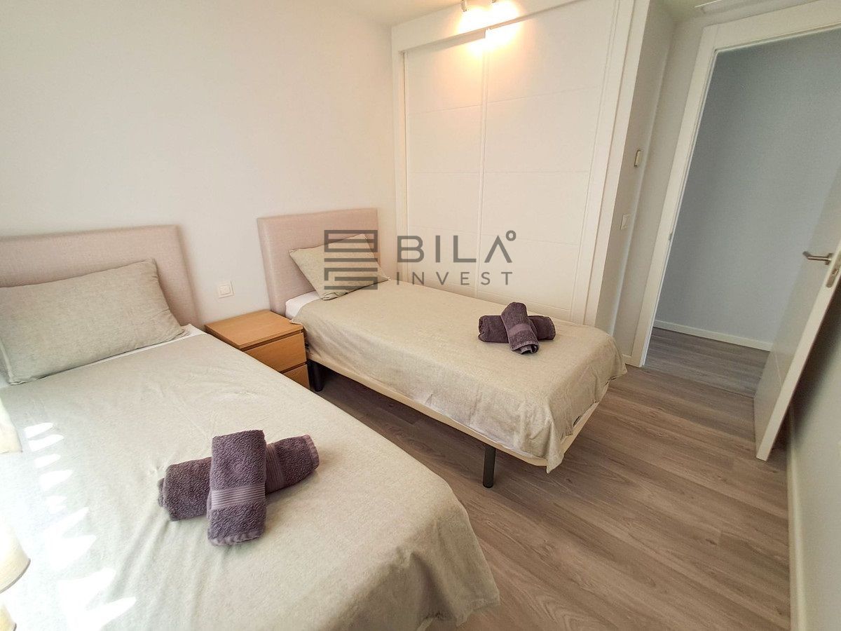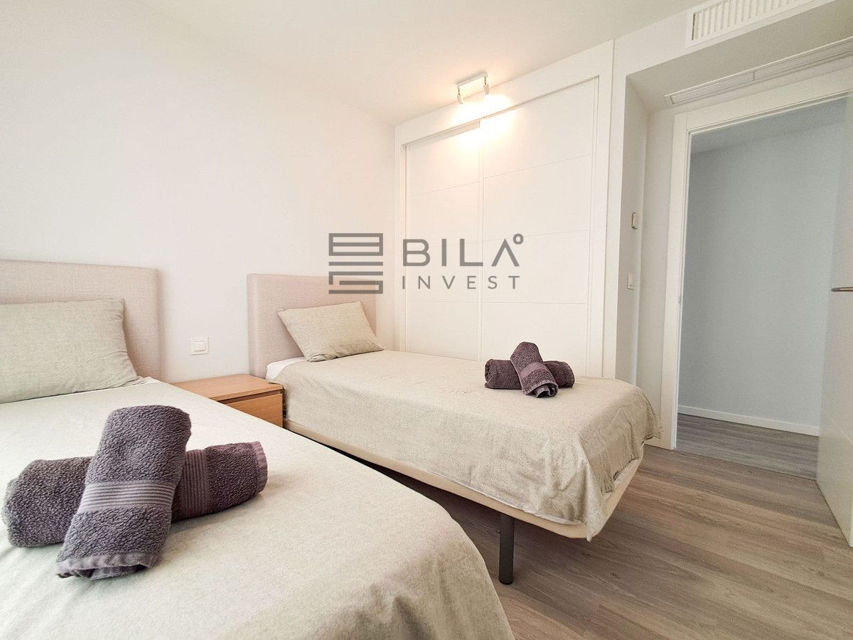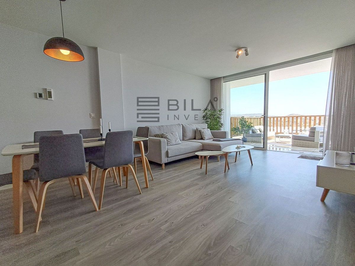 El apartamento está amueblado con mobiliario minimalista de alta calidad, en colores suaves que evocan elegancia y calma.