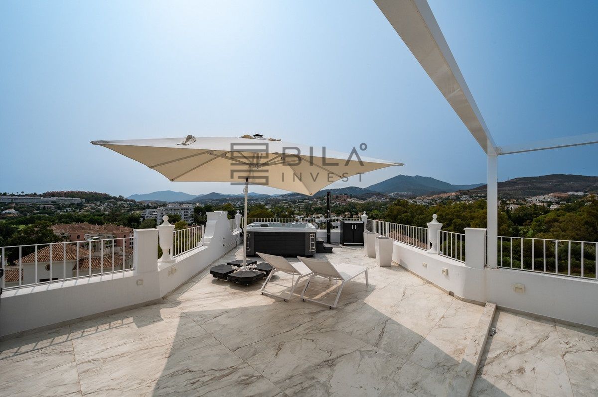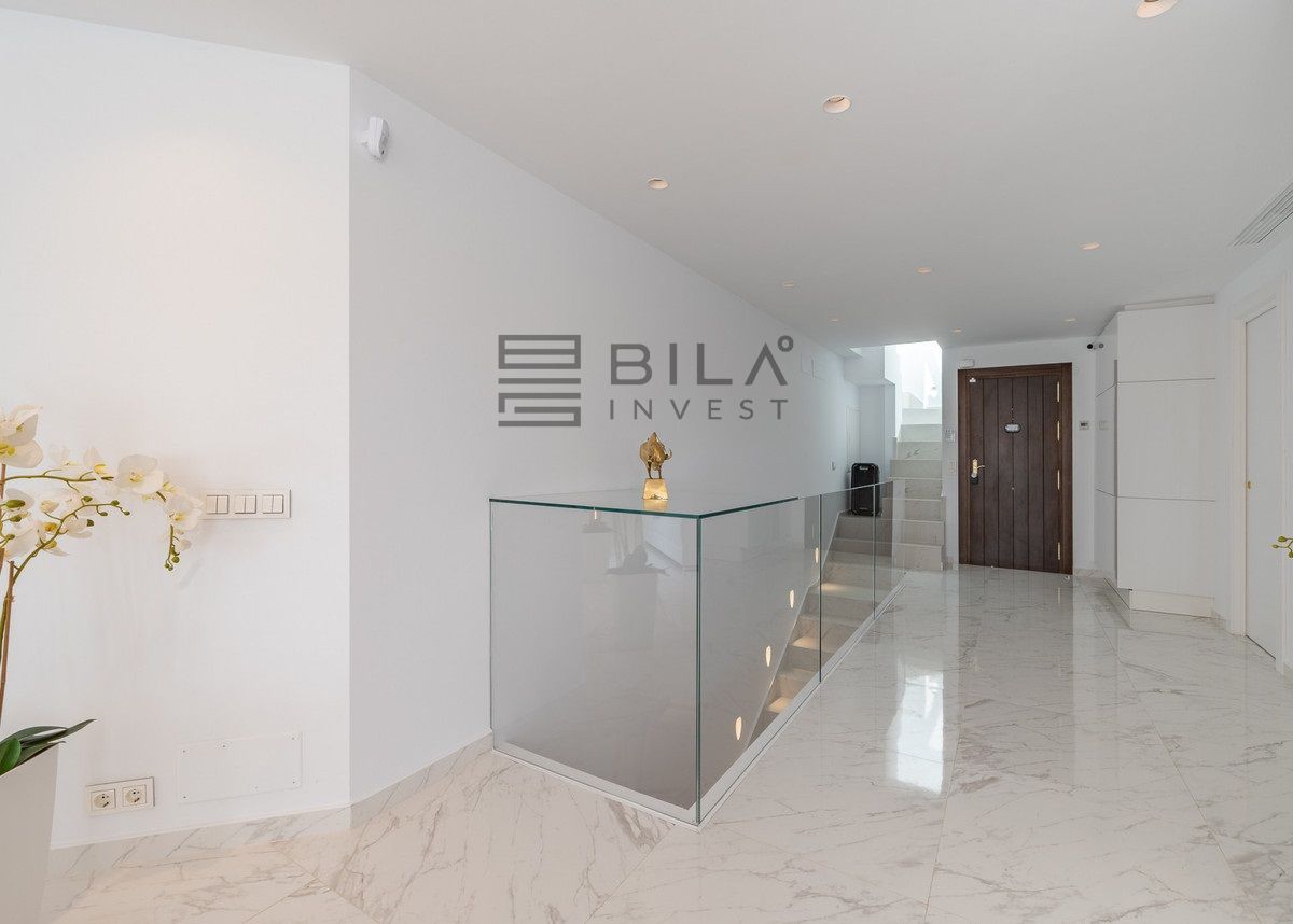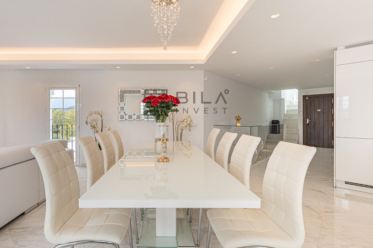 Con una superficie de 158 m² distribuidos en tres plantas, la casa adosada fusiona un diseño moderno con abundante luz natural. La planta de entrada cuenta con una elegante cocina de concepto abierto con una isla de desayuno brillante (con capacidad para tres personas) y ventanales de suelo a techo que inundan el espacio de luz solar. Junto a la cocina, el luminoso salón-comedor se integra perfectamente con el exterior, gracias a puertas correderas que potencian la sensación de amplitud y luminosidad. Un dormitorio de invitados con baño en suite, también en esta planta, se beneficia de la misma cálida luz natural. Los dormitorios principal y secundario, situados en la planta inferior, incluyen baños en suite diseñados con líneas limpias y acabados contemporáneos. El elemento más destacado es la terraza en la azotea de 100 m² con vistas ininterrumpidas al atardecer sobre el Valle del Golf. Diseñada para disfrutar tanto del interior como del exterior, la disposición minimalista de la terraza y sus superficies bañadas por el sol la convierten en un lugar ideal para relajarse o recibir invitados. Cada nivel prioriza la luz y la simplicidad moderna, creando un hogar luminoso y acogedor.