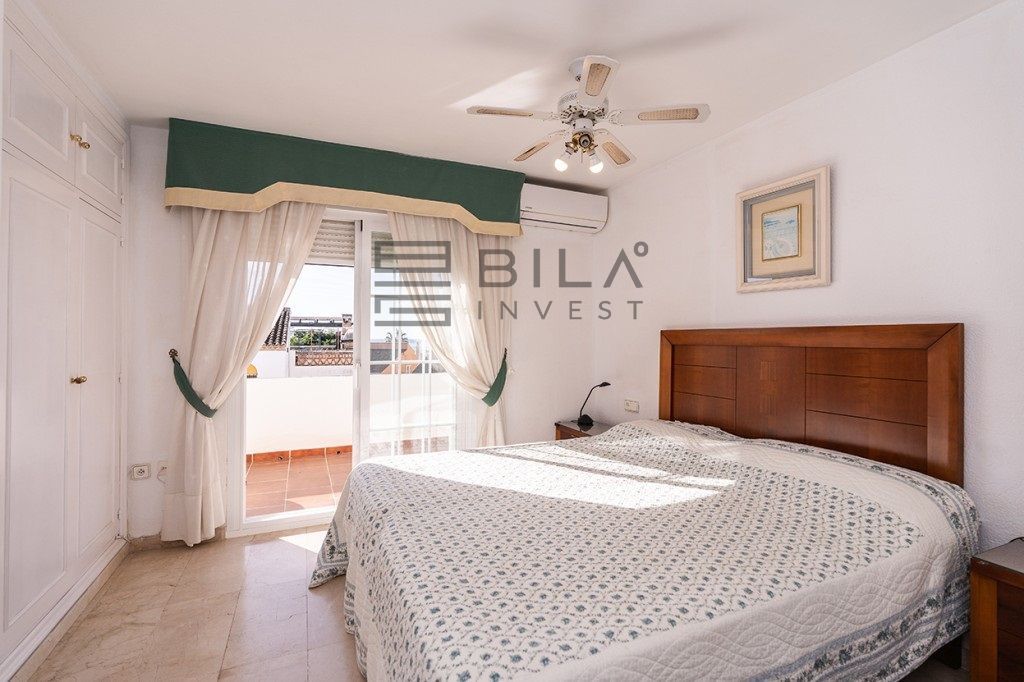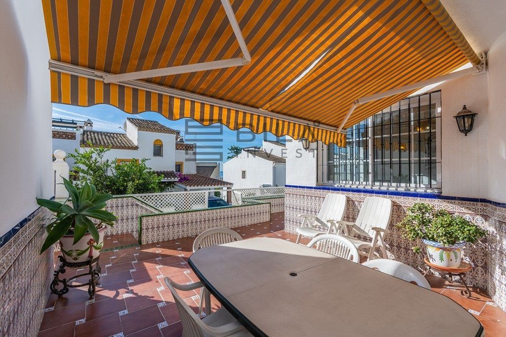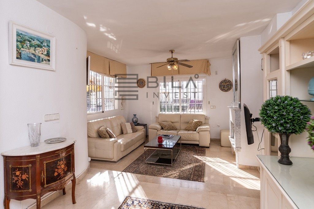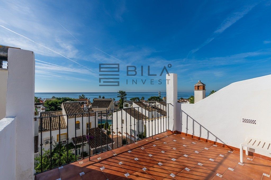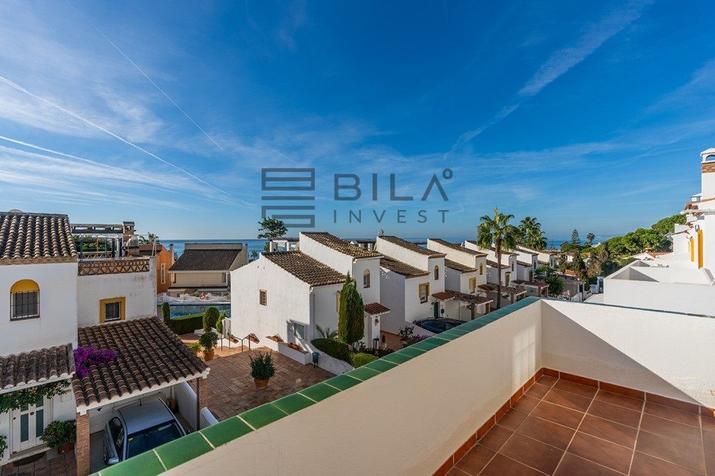Amplia y luminosa casa adosada en esquina en la urbanización Costabella, al este de Marbella. La vivienda, distribuida en dos plantas, cuenta con tres dormitorios, tres baños, un salón de buen tamaño, una gran cocina, terraza delantera y terraza trasera. Impresionantes vistas al mar desde la primera planta y la azotea. La casa ofrece un gran potencial, ya que dispone de un sótano que podría convertirse en más dormitorios o en lo que se desee. Magnífico complejo a pocos pasos de la playa, con una gran piscina, jardín y aparcamiento. El centro de Marbella está a tan solo 10 minutos en coche.