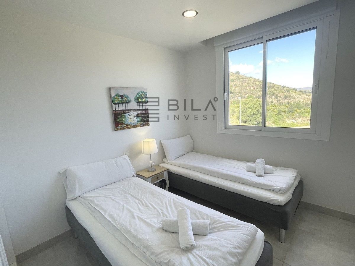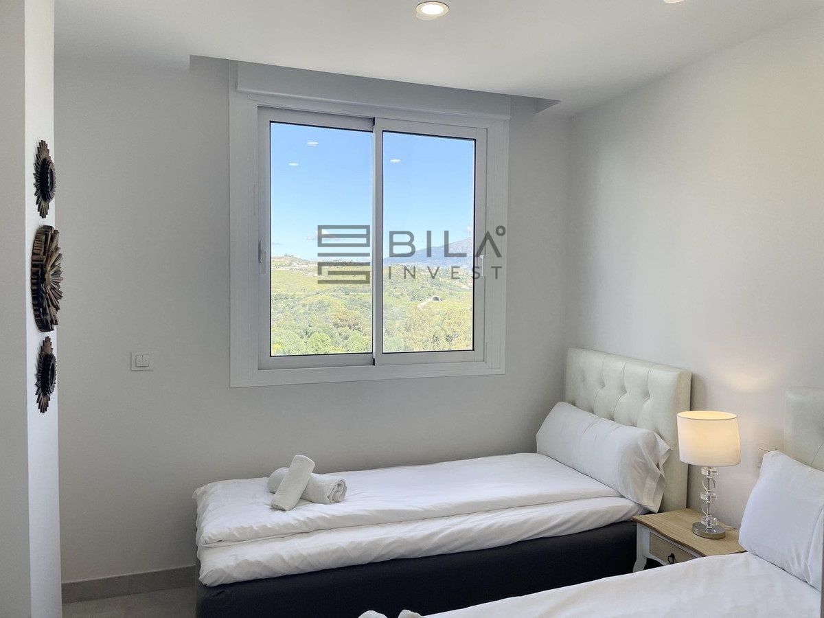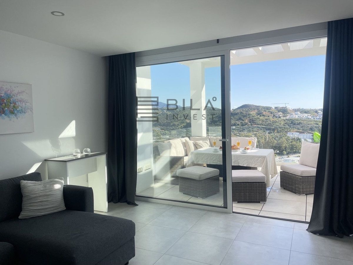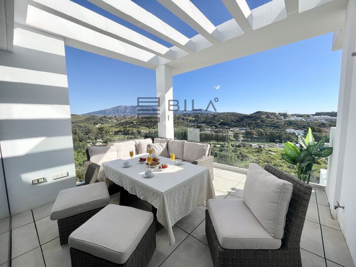 El apartamento se encuentra en la primera planta con acceso mediante ascensor y entrada directa desde la plaza de aparcamiento privada. Al entrar, te recibe un espacio abierto y luminoso donde la cocina y el salón se integran perfectamente y dan salida a la terraza con sol de mañana. Uno de los dormitorios es en suite con baño privado, mientras que los otros dos comparten un baño adicional. Todos los dormitorios cuentan con armarios empotrados, vistas a las montañas y aire acondicionado instalado en toda la vivienda para mayor confort durante todo el año. Todas las ventanas y puertas de cristal son de doble acristalamiento.