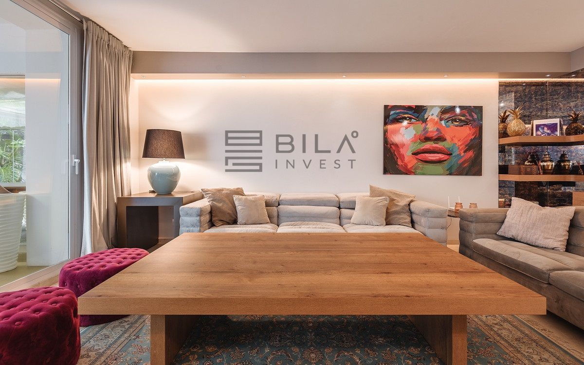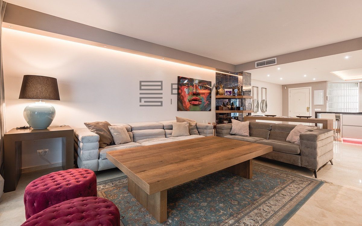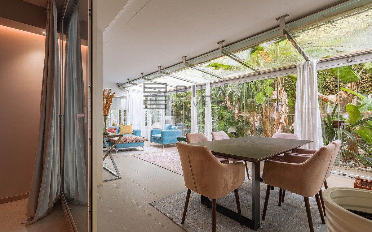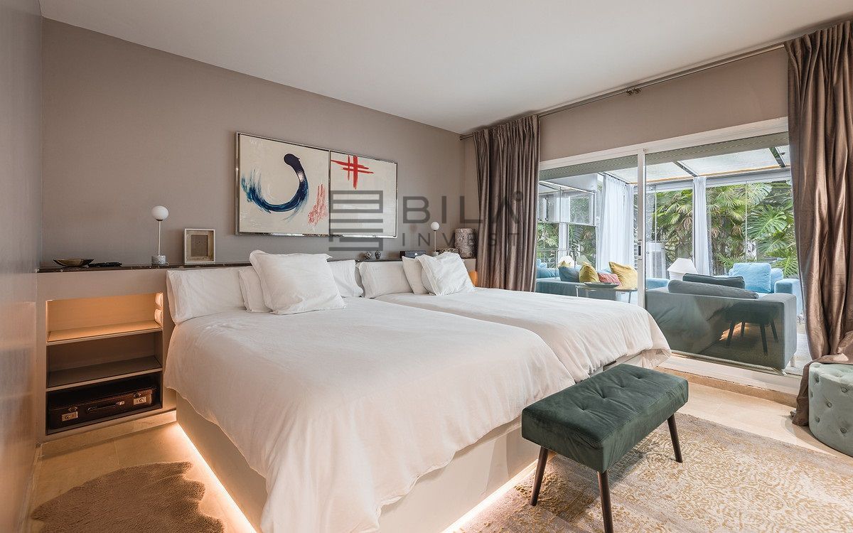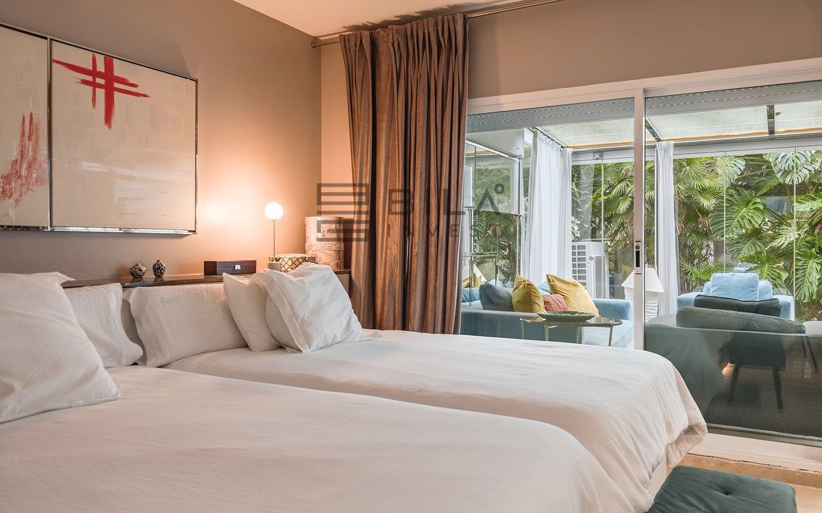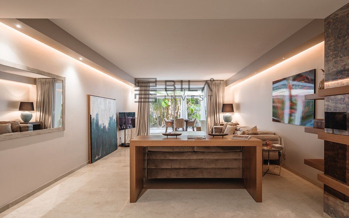 Apartamento en planta baja exquisitamente presentado, situado en una urbanización con seguridad 24 horas en Las Lomas del Marbella Club, en el corazón de la Milla de Oro. La propiedad ha sido completamente renovada y aprovecha al máximo toda su distribución de planta abierta que une la cocina, el salón y la gran terraza al aire libre, a la perfección. Los grandes ventanales del suelo al techo se abren desde el salón a un exuberante jardín tropical y a una terraza cubierta con cortinas de cristal ajustables que pueden abrirse en los meses de verano para proporcionar un increíble espacio de ocio dentro de un entorno muy privado. El apartamento aprovecha al máximo los metros cuadrados y ofrece dos amplios dormitorios, cada uno con su propio baño en suite. El dormitorio principal se abre y conecta con la gran terraza hacia la parte trasera de la vivienda. El complejo ofrece una piscina exterior con maravillosas vistas al mar, gimnasio y sauna para los residentes. La propiedad incluye 1 plaza de aparcamiento y un gran trastero. Situada en una zona muy cotizada, aproximadamente a mitad de camino entre Marbella ciudad y Puerto Banús.