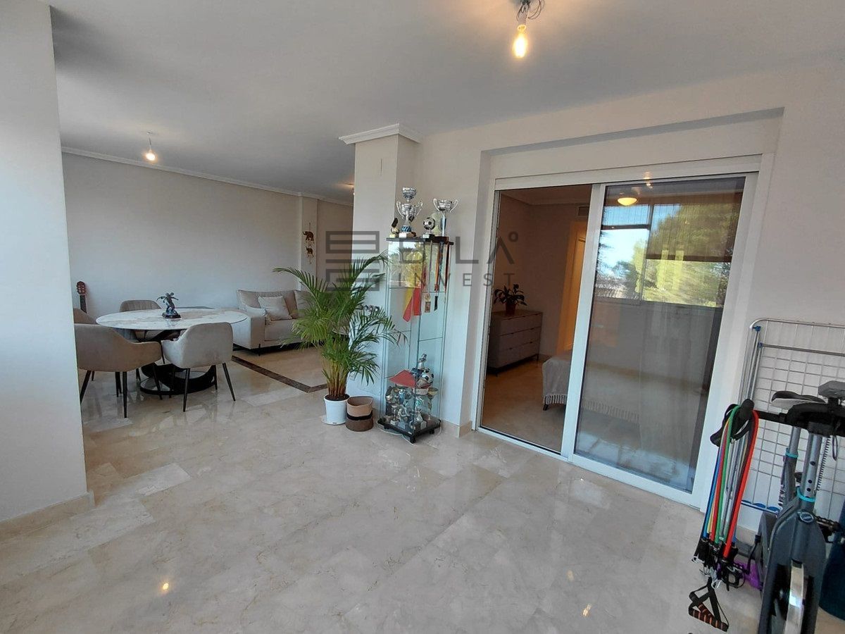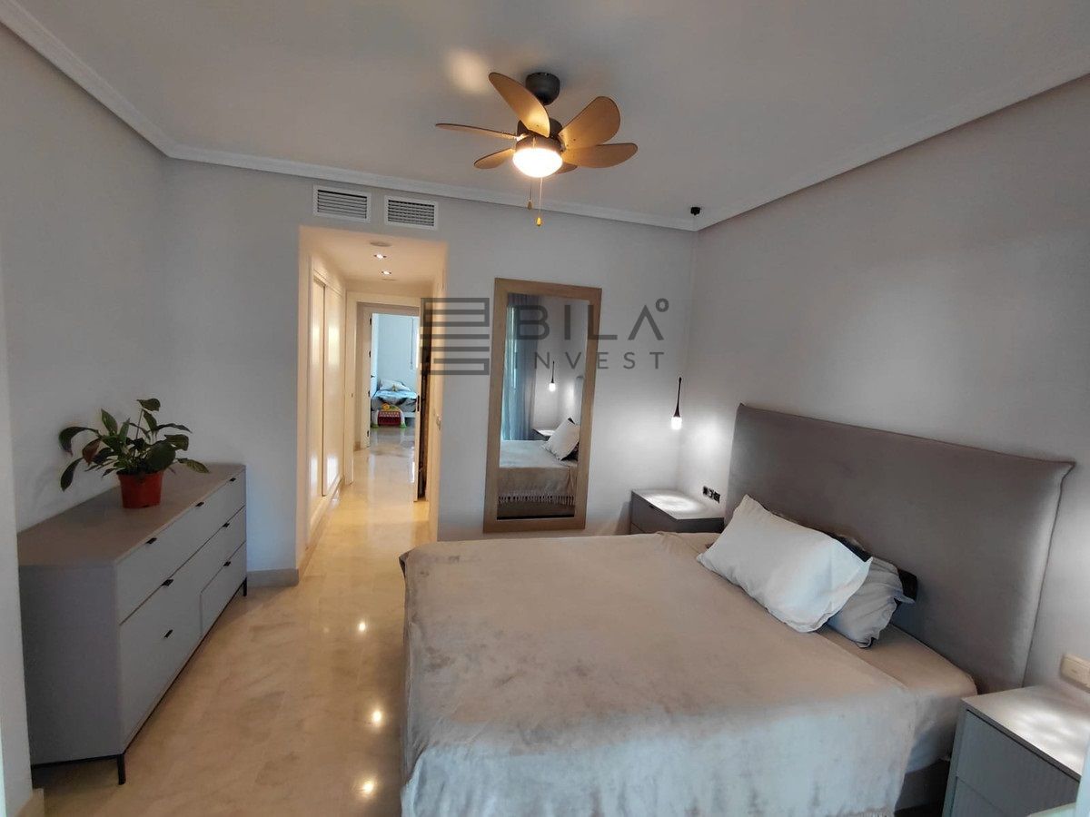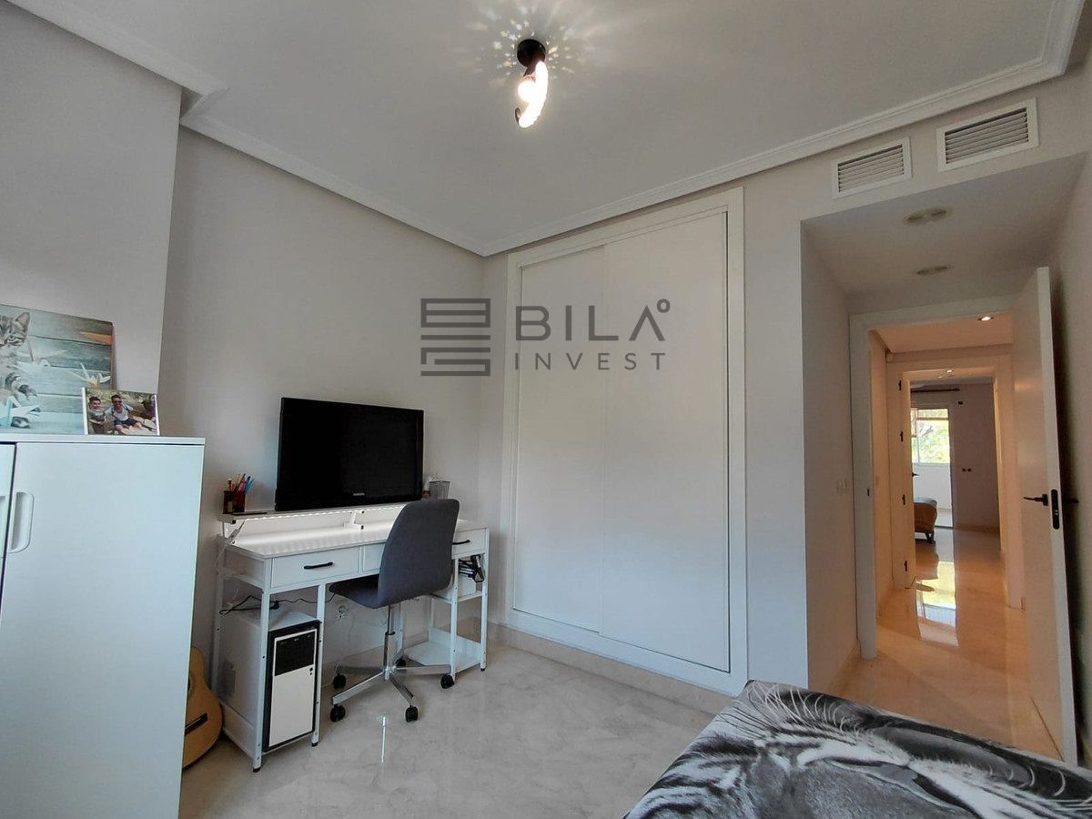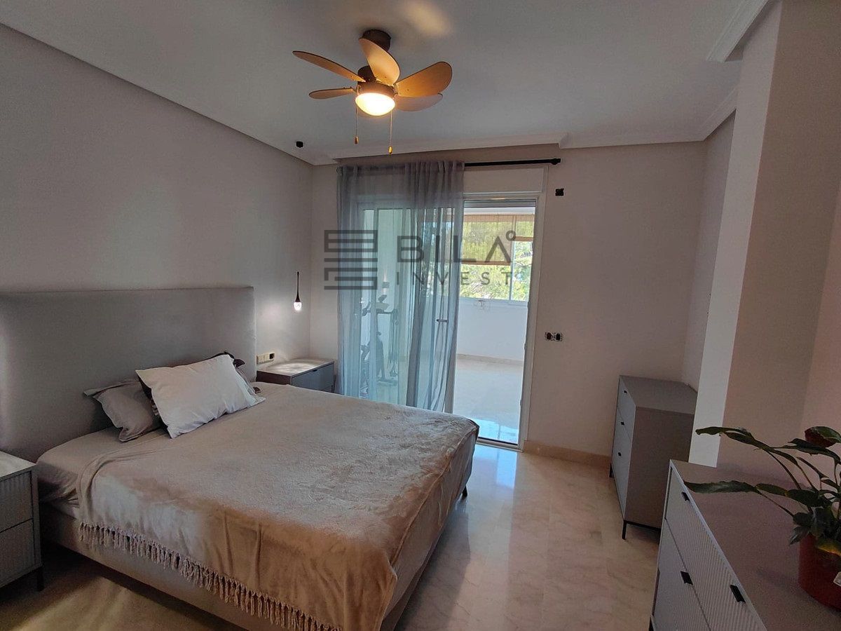 La vivienda cuenta con 120 m² distribuidos de forma luminosa y funcional. El salón-comedor orientado al sur disfruta de agradables vistas sobre las zonas verdes y hacia el horizonte del mar. La cocina moderna, totalmente renovada y equipada con electrodomésticos de alta gama, se integra perfectamente con el resto de la vivienda. Dispone de dos amplios dormitorios, dos baños (uno en suite), armarios empotrados y suelos de mármol.