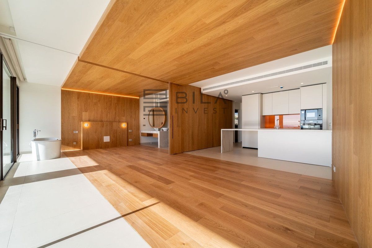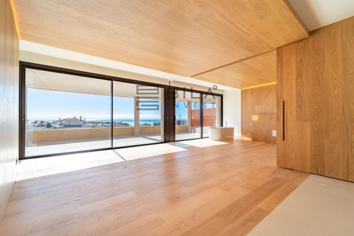 Dormitorio principal con baño en suite y vestidor. Este apartamento se distingue por el ingenioso muro móvil que conecta la suite del dormitorio principal con el salón. Este ingenioso diseño no solo permite maximizar la luz de la Costa del Sol en ambas estancias, sino que también te permitirá admirar las espléndidas vistas desde cualquier rincón de tu hogar.