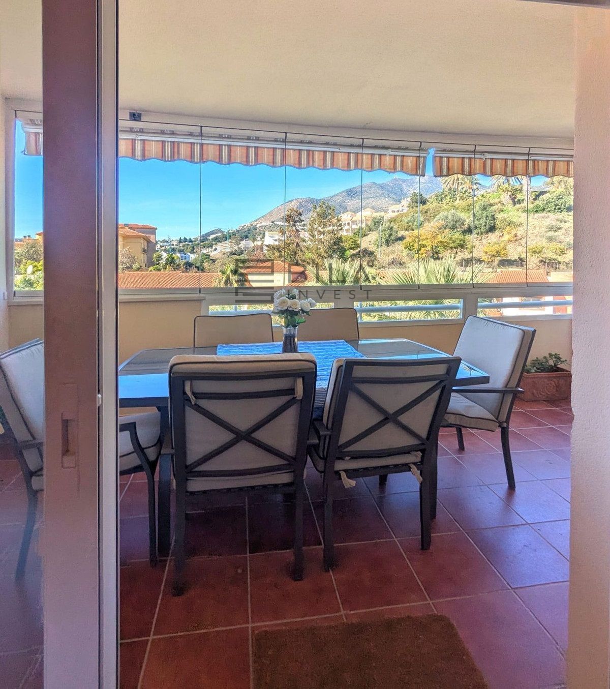 una parte acristalada con sistema Lumon, perfecta para disfrutarla todo el año como comedor o zona de estar, y otra parte abierta, ideal para tomar el sol y disfrutar del clima de la Costa del Sol.
